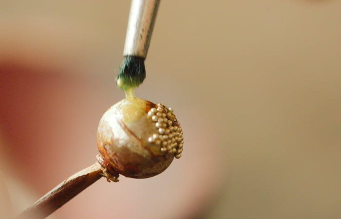Im nächsten Schritt werden die Jawans sorgsam von Hand aufgetragen. Dabei sind Geduld und viel Geschick erforderlich, um die filigranen Kügelchen gleichmäßig auf der Oberfläche anzubringen. Hierzu wird Klebstoff verwendet, der aus den Samen einer auf Bali heimischen Pflanze (Pling Pling) gewonnen wird. Den gesamten Ablauf kannst Du Dir in unserem “MAKING OF “ ansehen.