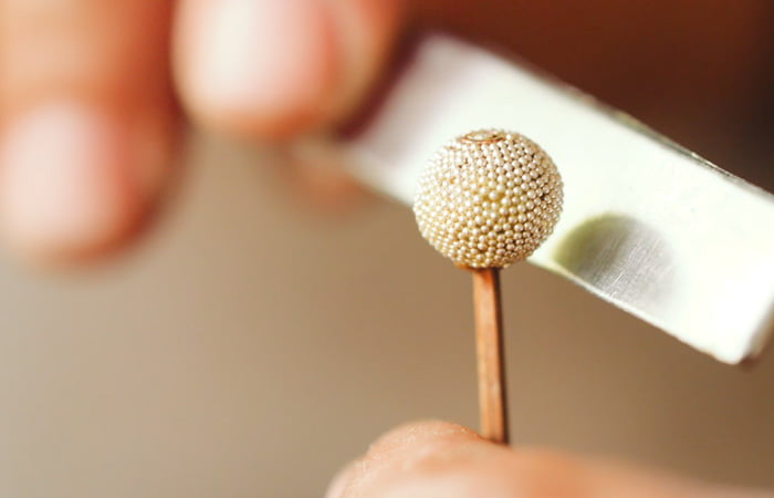 Die Herstellung der Silberperlen (sog. Jawan Beads) erfordert dabei viel Erfahrung und Geschick, um gleich große, runde Kugeln zu schmieden und die winzigen Silberkügelchen (Jawans) gleichmäßig aufzutragen. Mehr Details zu ihrer Herstellung findest Du im Folgenden auf dieser Seite.