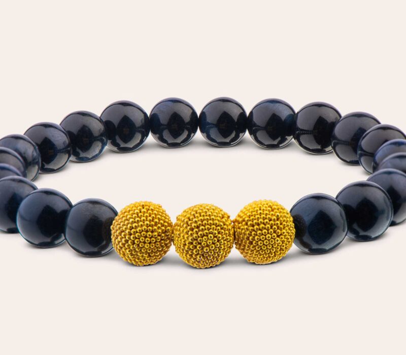 Unser elegantes Damenarmband aus nachtblauem Tigerauge in 8 mm besticht durch die ruhige Harmonie mit den vergoldeten Silberperlen – Dein Eyecatcher für den stilvollen Alltag.