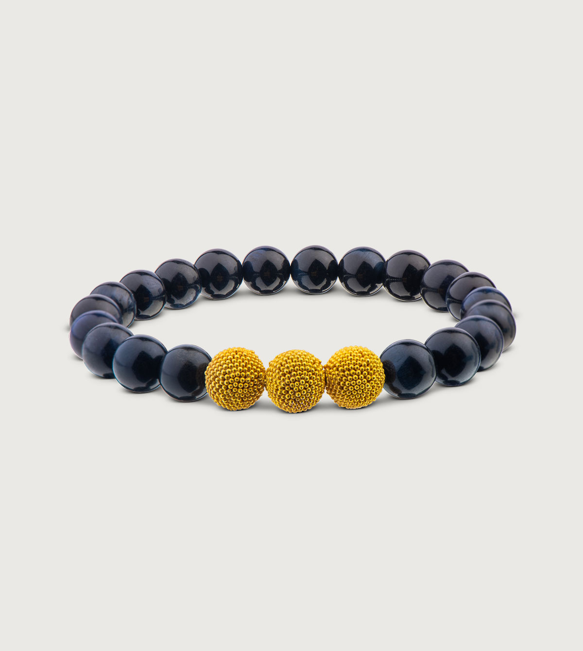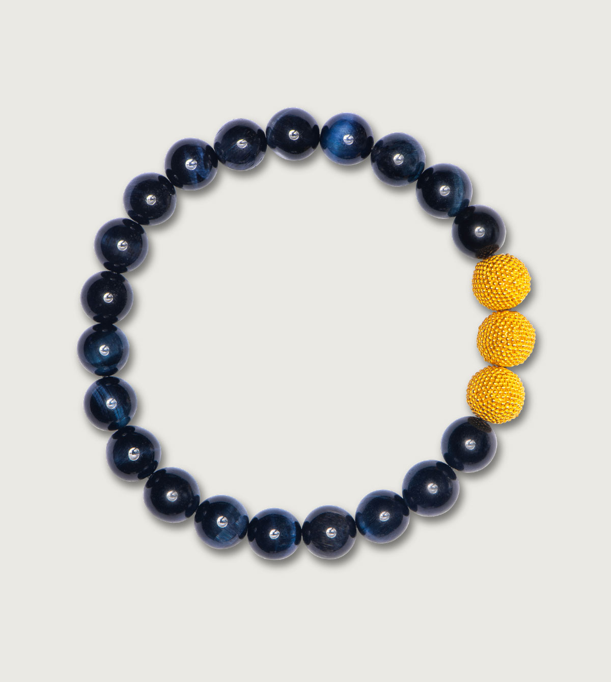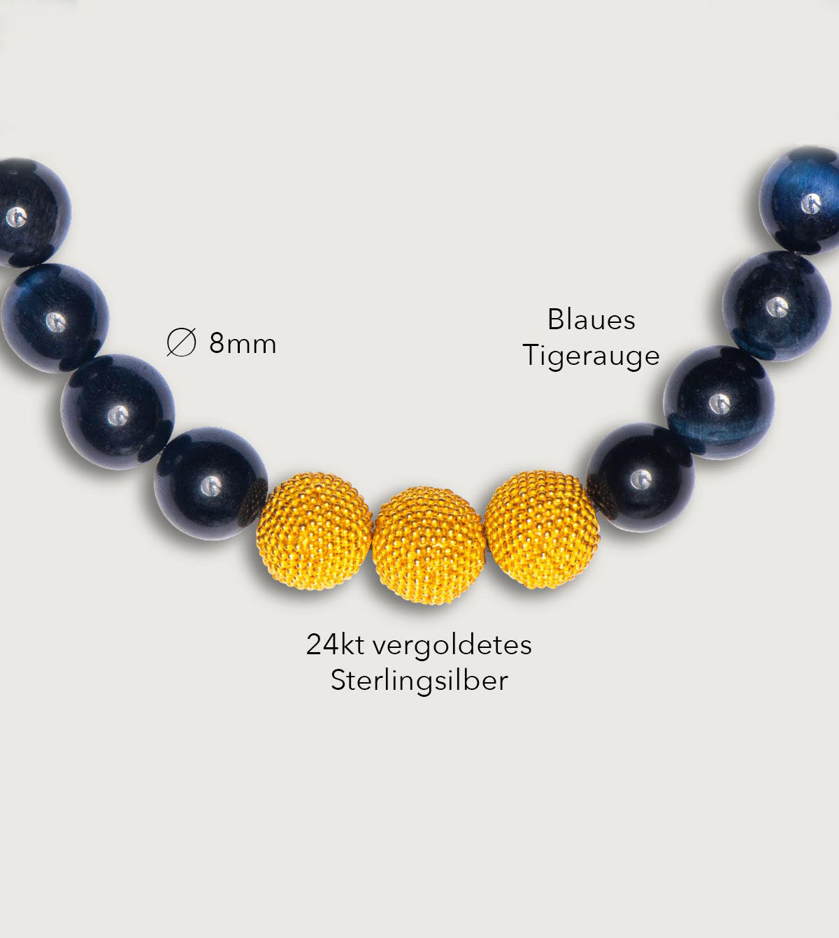 Unser elegantes Damenarmband aus nachtblauem Tigerauge in 8 mm besticht durch die ruhige Harmonie mit den vergoldeten Silberperlen - Dein Eyecatcher für den stilvollen Alltag, passend zu Jeans ebenso wie zum schicken Business Outfit.