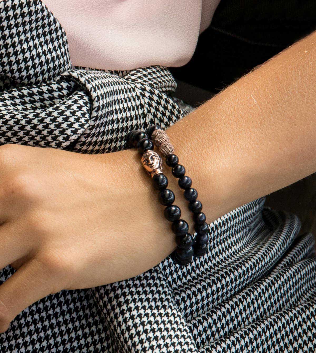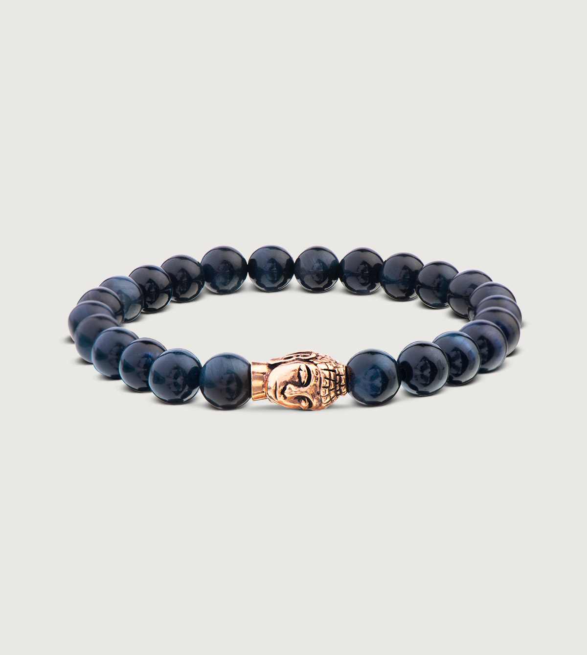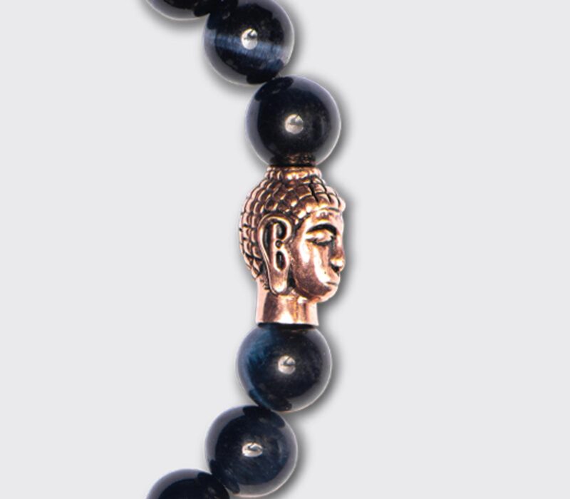 Die Ruhe ausstrahlenden Beads des blauen Tigerauges in 8 mm bestechen an diesem Damenarmband durch die stilvolle Symbiose mit edlem Roségold des vergoldeten Buddha für einen eleganten Akzent an Deinem Handgelenk. Einfach unkompliziert schön und minimalistisch für ein dezentes Statement.