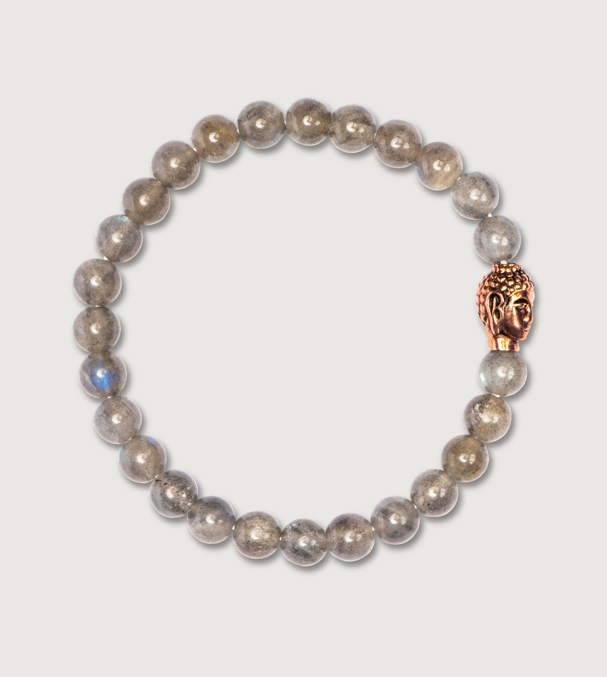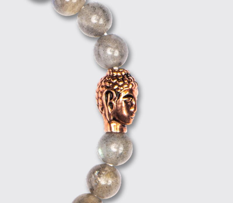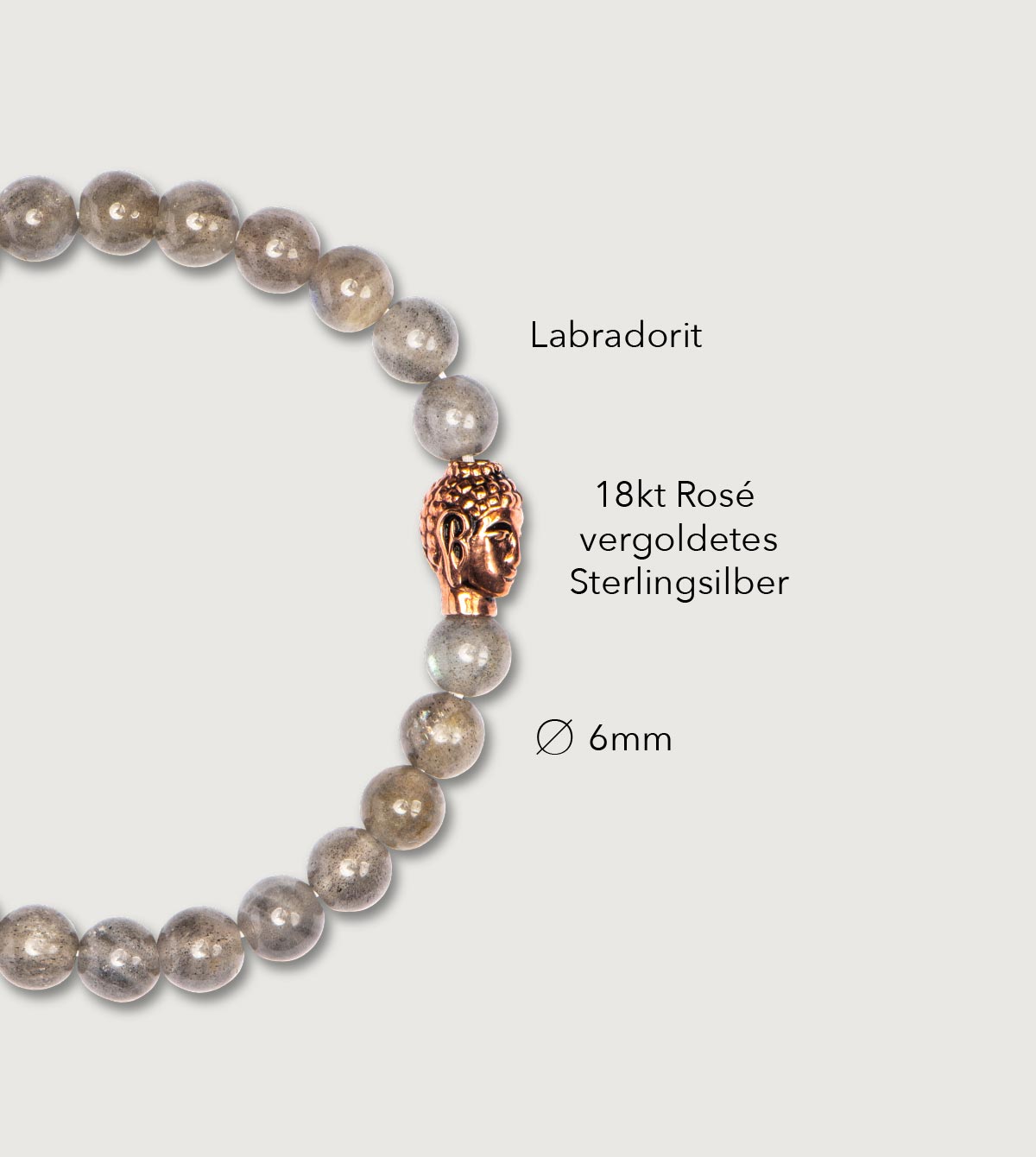 Eine klassische Kombination aus Rosé und Grau interpretiert mit Labradorit in 6 mm verleiht diesem Damenarmband einen betont femininen Touch. Der in Roségold vergoldete Buddha ergänzt die schlichte Farbgebung harmonisch und erzeugt einen edlen Blickfang im dezenten Auftreten dieses Buddha Armbands.