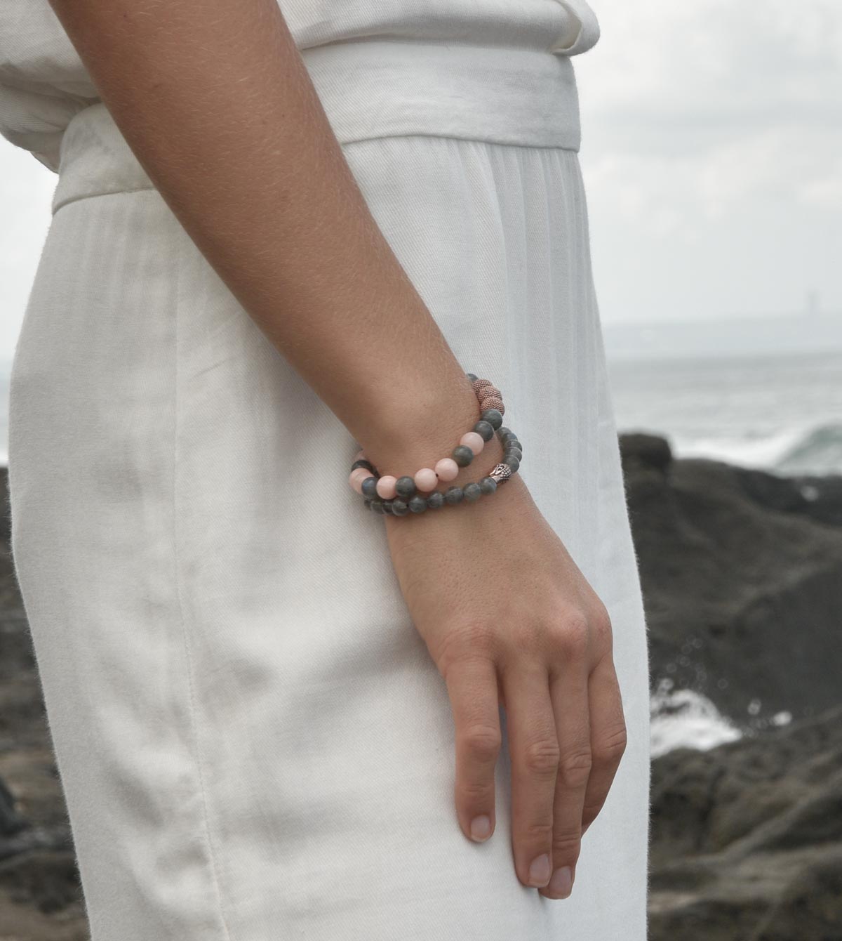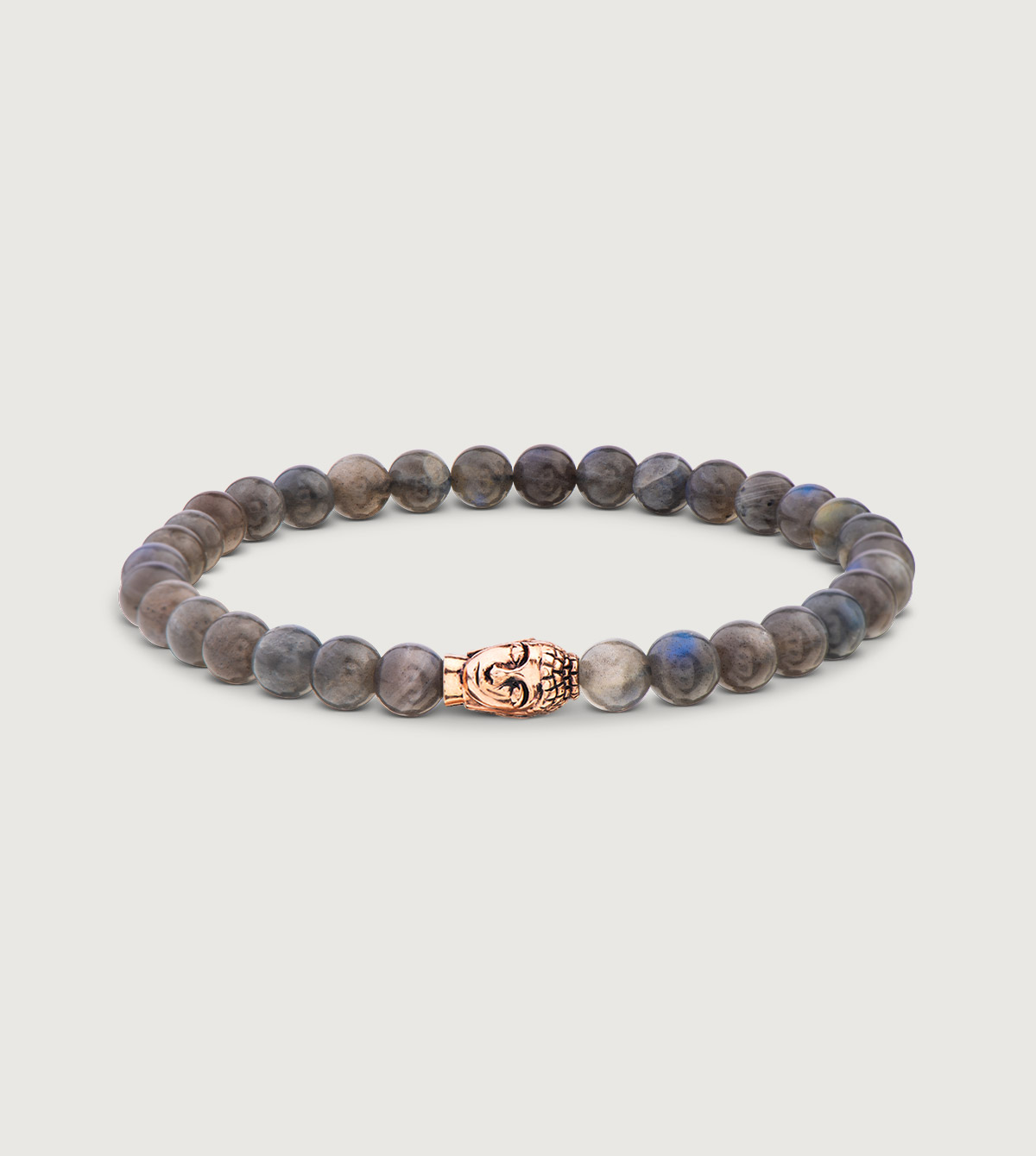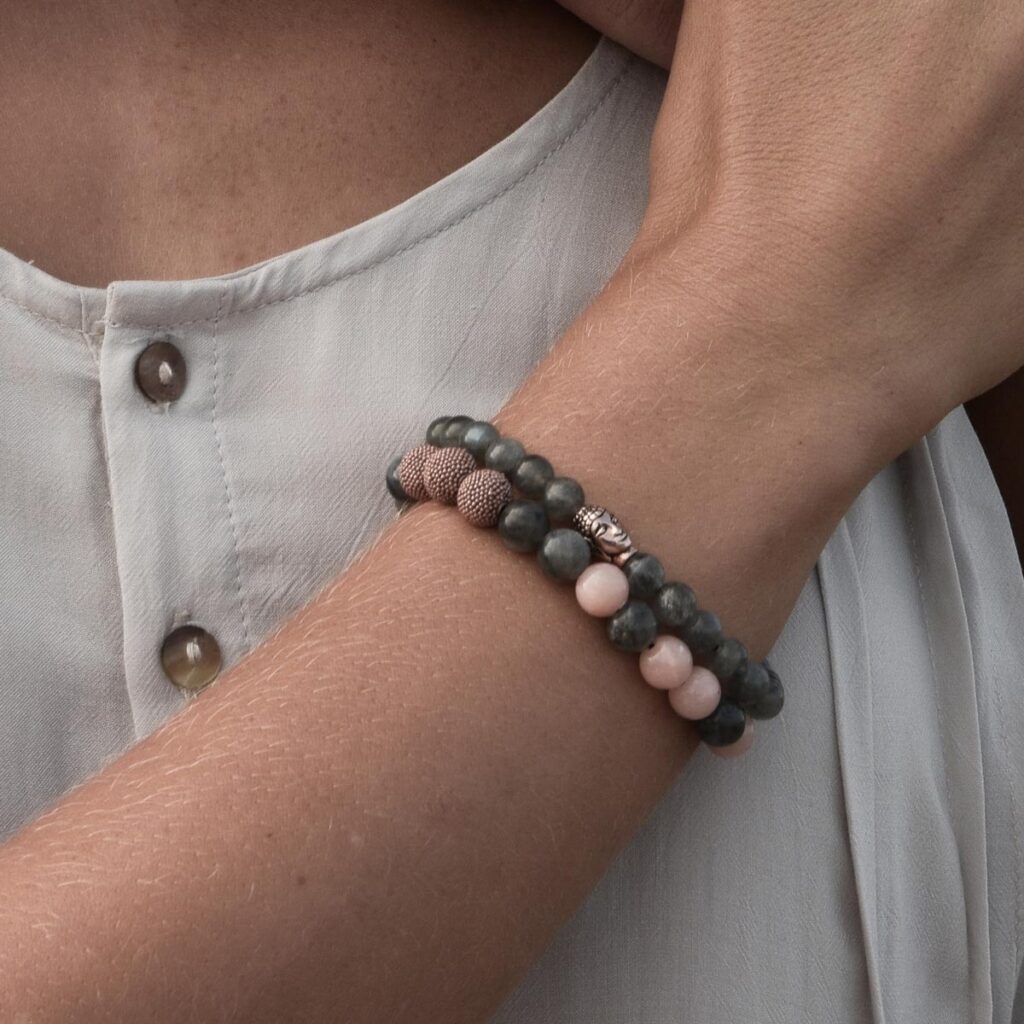Eine klassische Kombination aus Rosé und Grau interpretiert mit Labradorit in 6 mm verleiht diesem Damenarmband einen betont femininen Touch. Der in Roségold vergoldete Buddha ergänzt die schlichte Farbgebung harmonisch und erzeugt einen edlen Blickfang im dezenten Auftreten dieses Buddha Armbands.