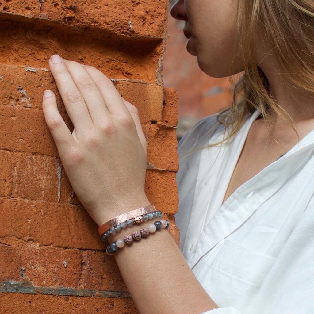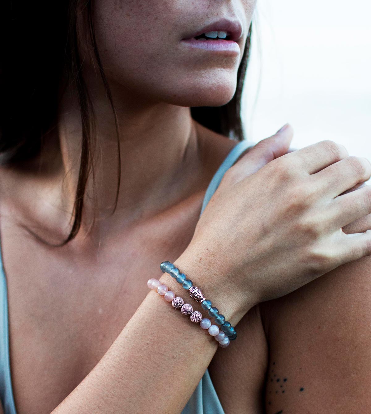 Alle Armbänder werden auf einem Stretchband aufgefädelt und gleiten so mühelos über Deine Hand. Wir empfehlen beim An- und Ablegen das Armband über den Handrücken zu rollen.