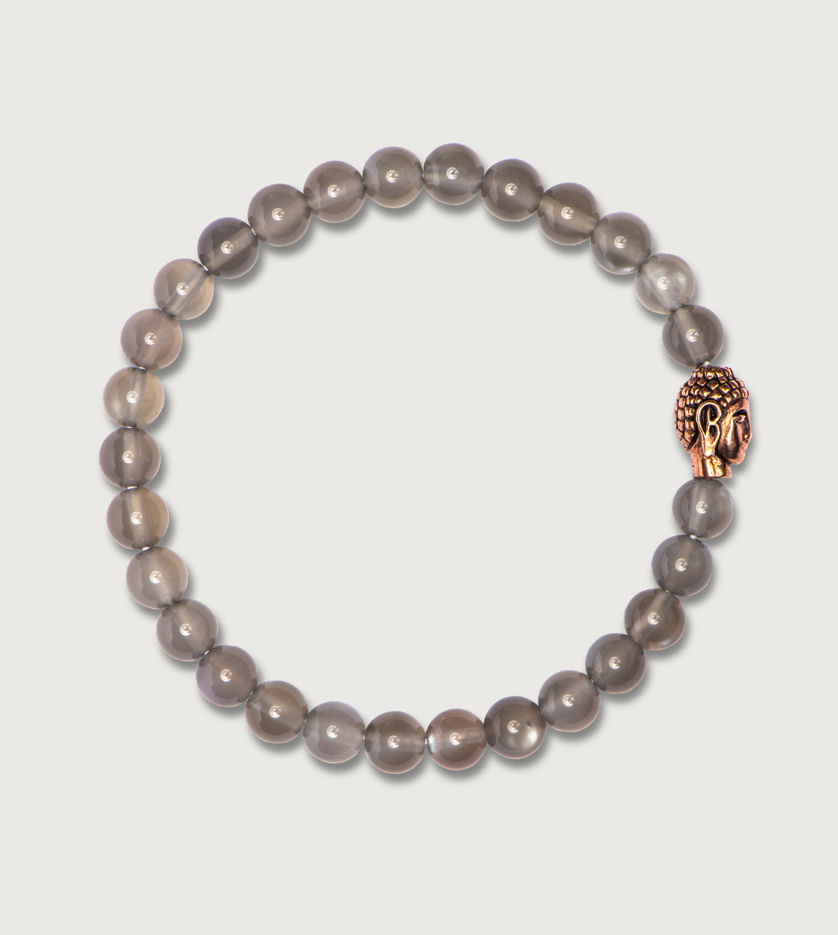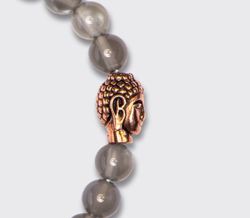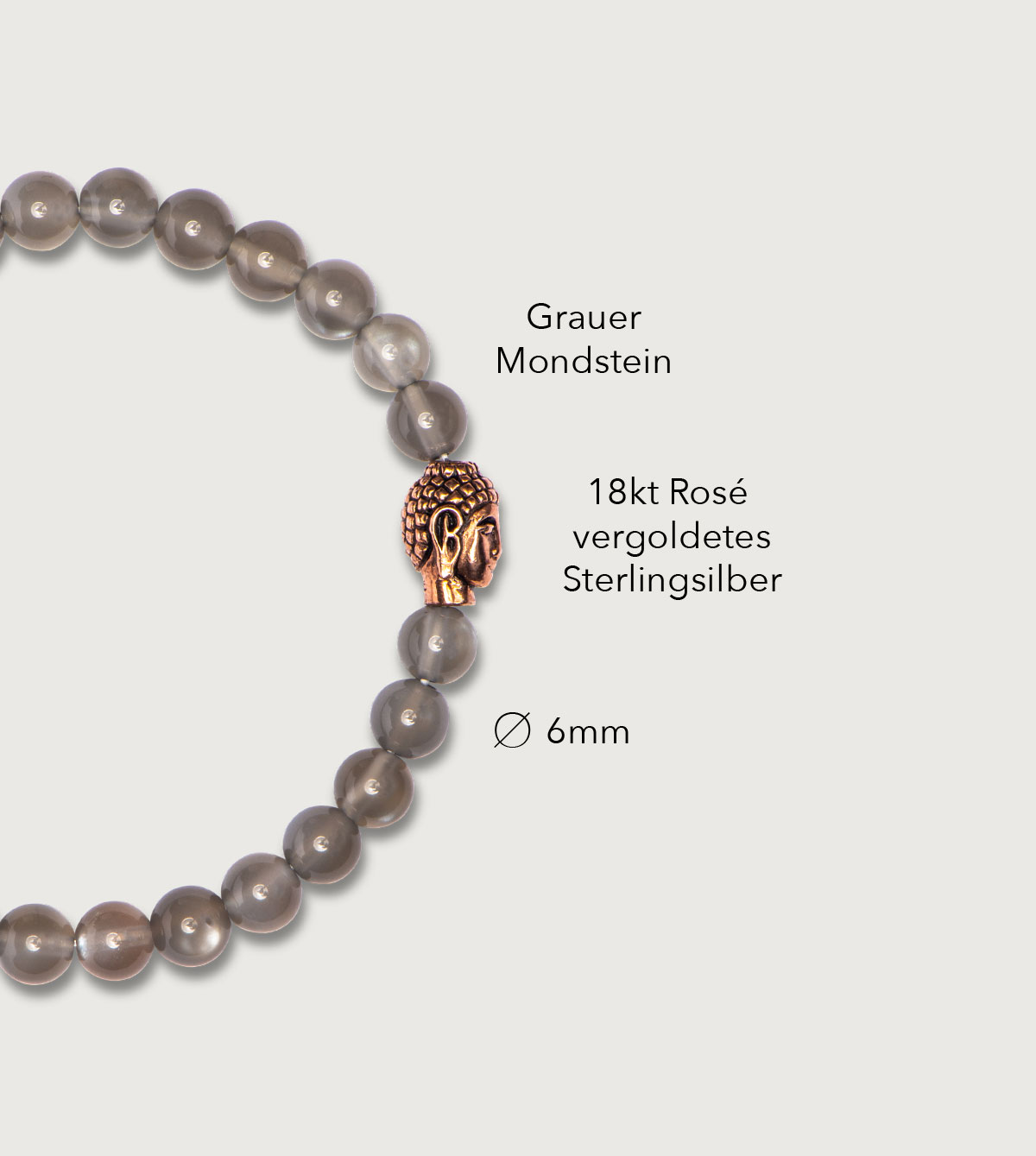 Exklusiver grauer Mondstein in 6 mm elegant kombiniert mit in Roségold vergoldeten Buddha bilden an diesem Damenarmband eine ästhetische Symbiose und machen es zum dezenten Highlight an Deinem Handgelenk.