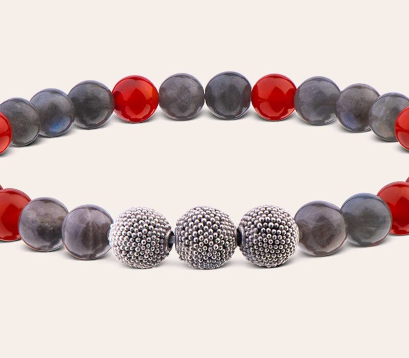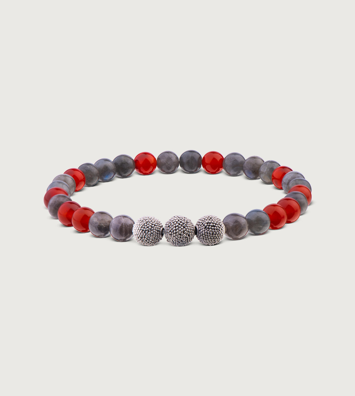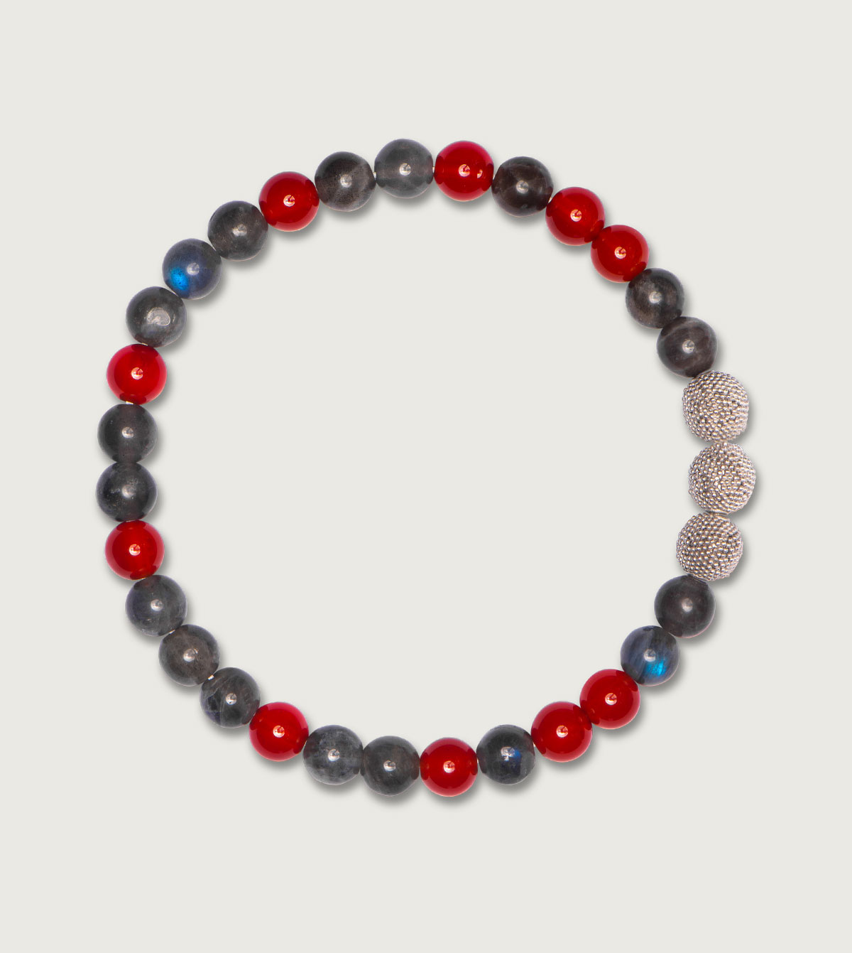 Charaktervolles Damenarmband aus kräftigem Rot und Grau mit Labradorit und Karneol Beads (6 mm). Die in Rhodium veredelten Silberperlen ergänzen die Edelsteinperlen eindrucksvoll für einen Hauch schlichte Eleganz am Handgelenk.