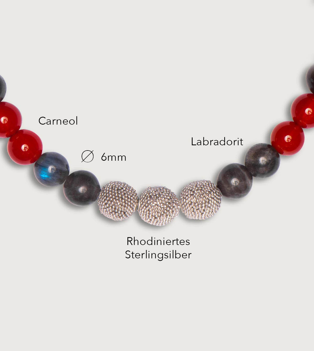 Charaktervolles Damenarmband aus kräftigem Rot und Grau mit Labradorit und Karneol Beads in 6 mm. Die in Rhodium veredelten Silberperlen ergänzen die Edelsteinperlen eindrucksvoll für einen Hauch schlichte Eleganz am Handgelenk.