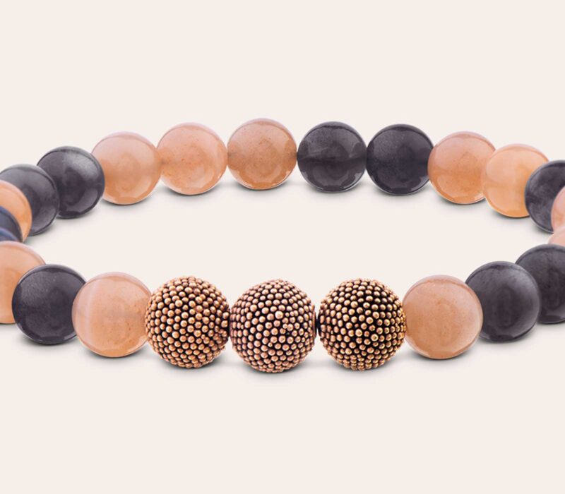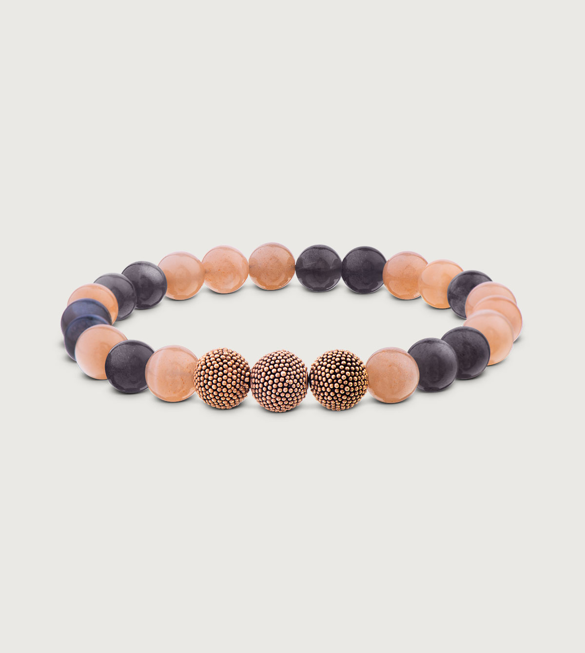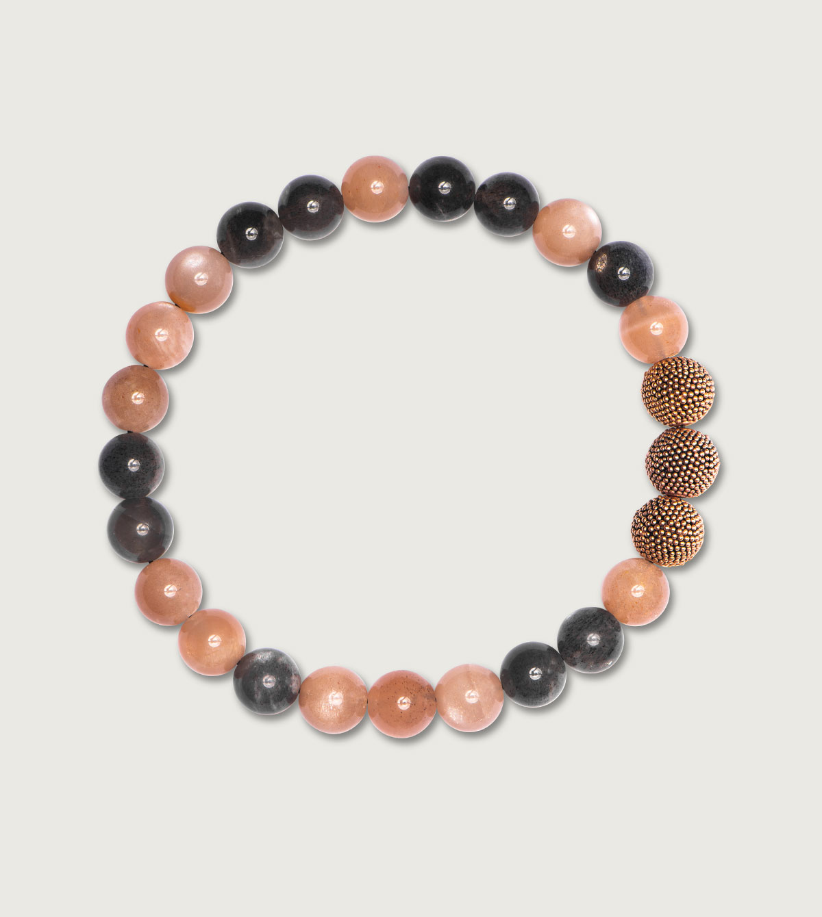 Jawan Beads aus Sterlingsilber sind seit Jahrhunderten Teil balinesischer Silberschmiedekunst. In Handarbeit wird eine Kugel gefertigt und winzige Kügelchen aufgetragen. Die Schmiede schätzen die Zeit und die Geschichten, welche die Kunst erzählt. So verleihen Tradition und Hingabe den Beads ihren besonderen Charakter. Perfekt zu den eleganten Farben des Mondsteins haben wir die Beads mit einer Vergoldung in 18 Karat Roségold samt edlem Matteffekt stilvoll akzentuiert.