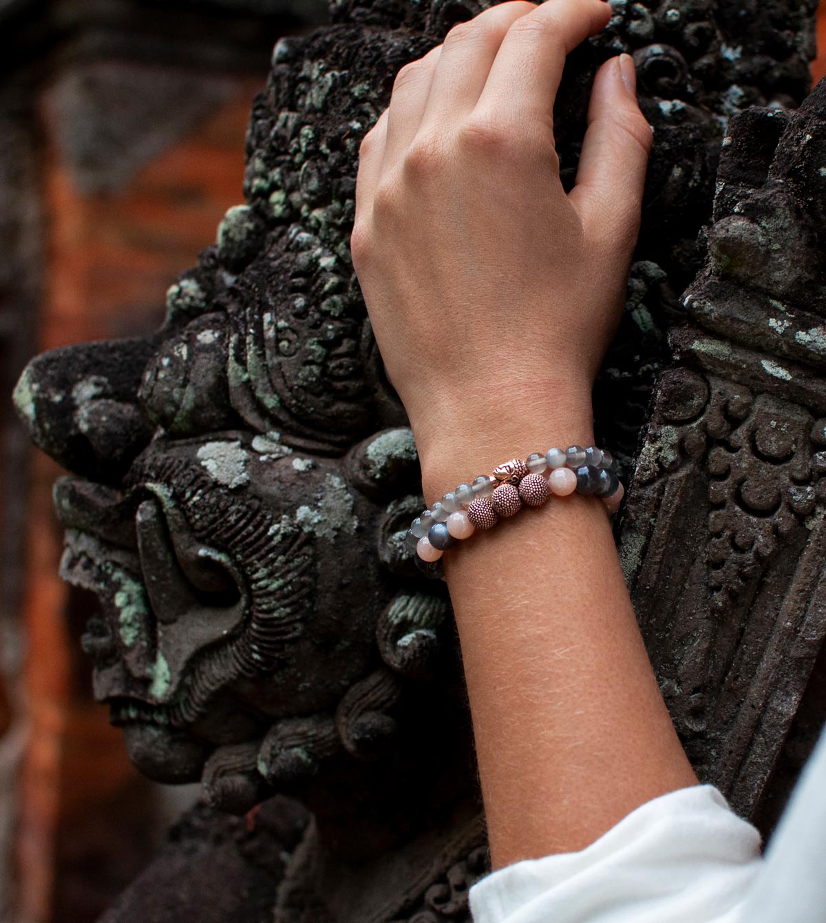 Rosa Mondstein hat durch seinen weichen, pfirsich-farbenen Schimmer eine grazile Ausstrahlung. Dabei ist sein Farbspiel leicht glasig, was dem Armband einen sanften Charakter verleiht. Im Hinduismus herrscht die Vorstellung, es handele sich beim Mondstein um verhärtete Strahlen des Mondes.