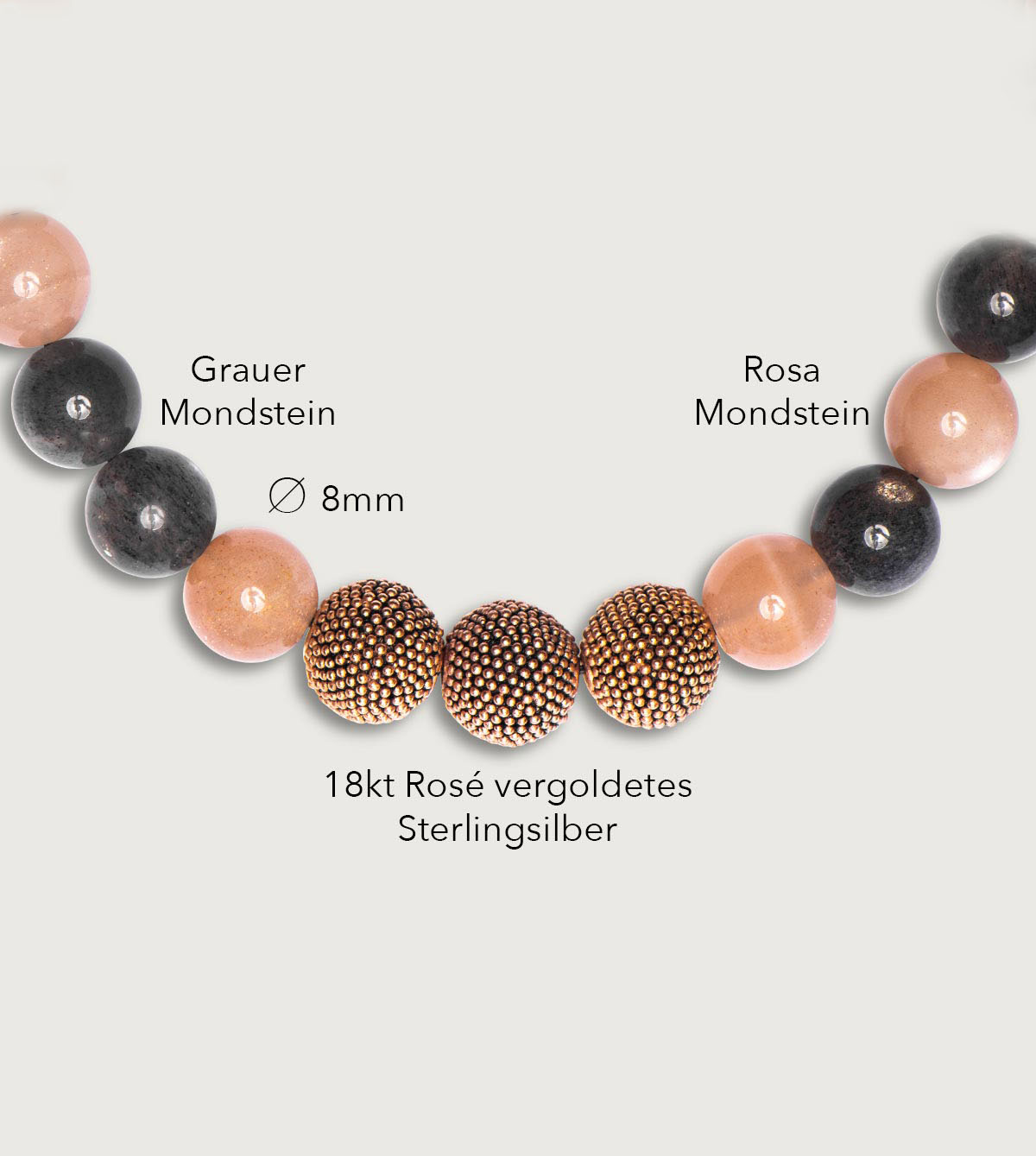 Verleihe Deinem Handgelenk ein besonderes Highlight mit unserem edelsten Damenarmband. Grauer und rosa Mondstein in 8 mm bildet mit den Roségold vergoldeten Silberperlen eine ästhetische Symbiose. Stilvolle Eleganz - einfach atemberaubend schön!