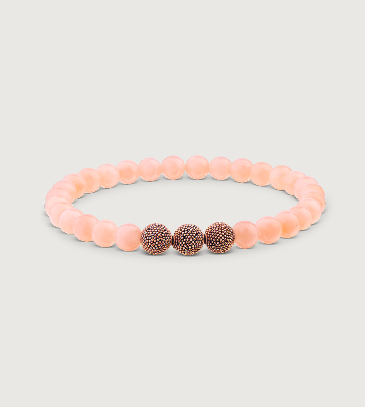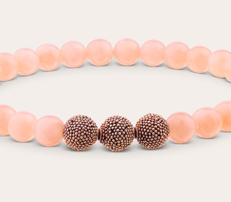 Die handgefertigten Jawan Beads aus 925er Sterlingsilber entstehen traditionell nach einer Jahrhunderte alten Silberschmiedekunst, bei der winzigste Kügelchen auf eine handgearbeitete Kugel aufgetragen werden. Traditionelles Handwerk und Hingabe verleihen den Beads so ihren einzigartigen Charakter. Als kräftigen Akzent zur rosa Jade haben wir die Beads mit einer Vergoldung in 18 kt Roségold samt Matteffekt stilvoll abgerundet.