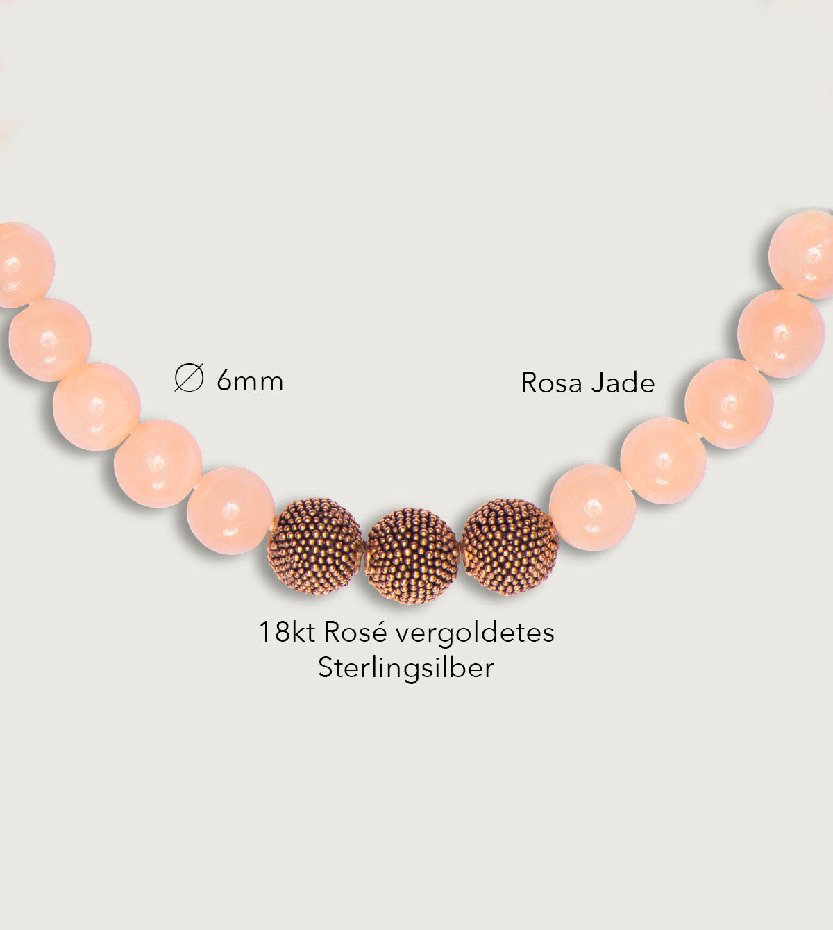 Unsere Jawan Beads bestehen aus 925er Sterlingsilber, überzogen mit einer dicken Schicht 18 Karat Roségold (mind. 2,5 Mikron - Vermeil). Dies ist 5-mal dicker und entsprechend langlebiger als bei einer einfachen Vergoldung.