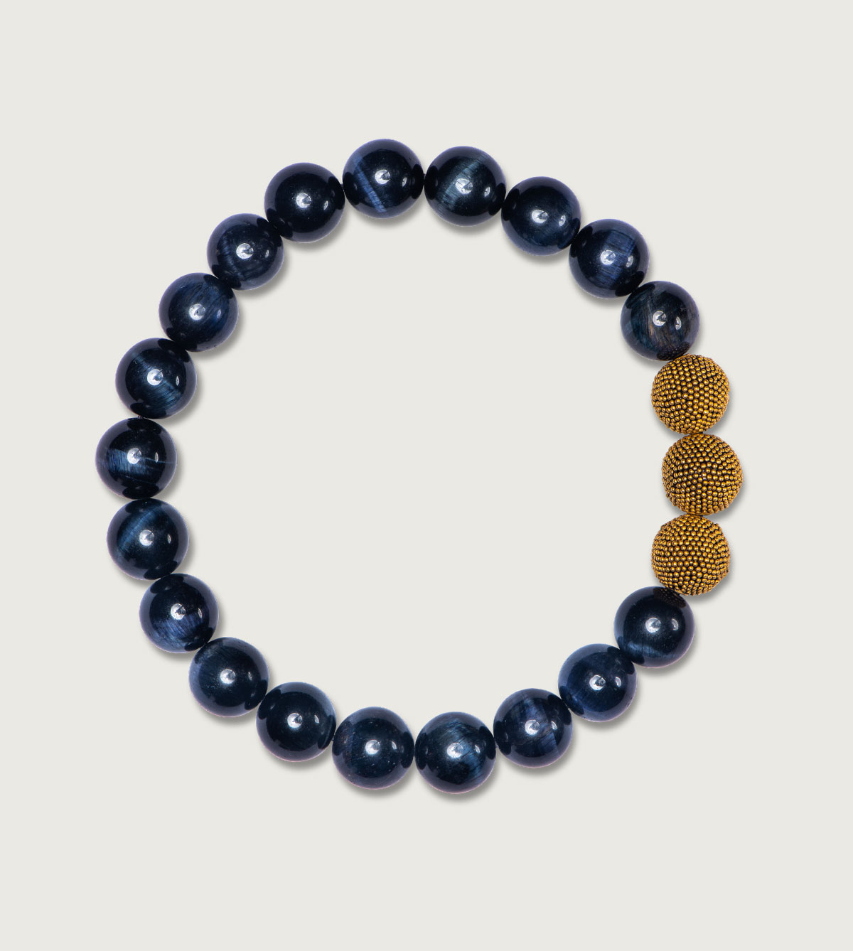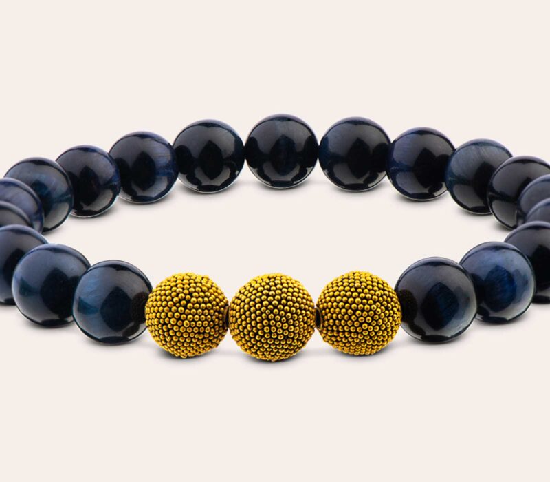 Unser elegantes Herrenarmband aus nachtblauem Tigerauge mit den markanten 10 mm Beads besticht durch die ruhige Harmonie mit den vergoldeten & mattierten Silberperlen - Dein Eyecatcher für den stilvollen Alltag.