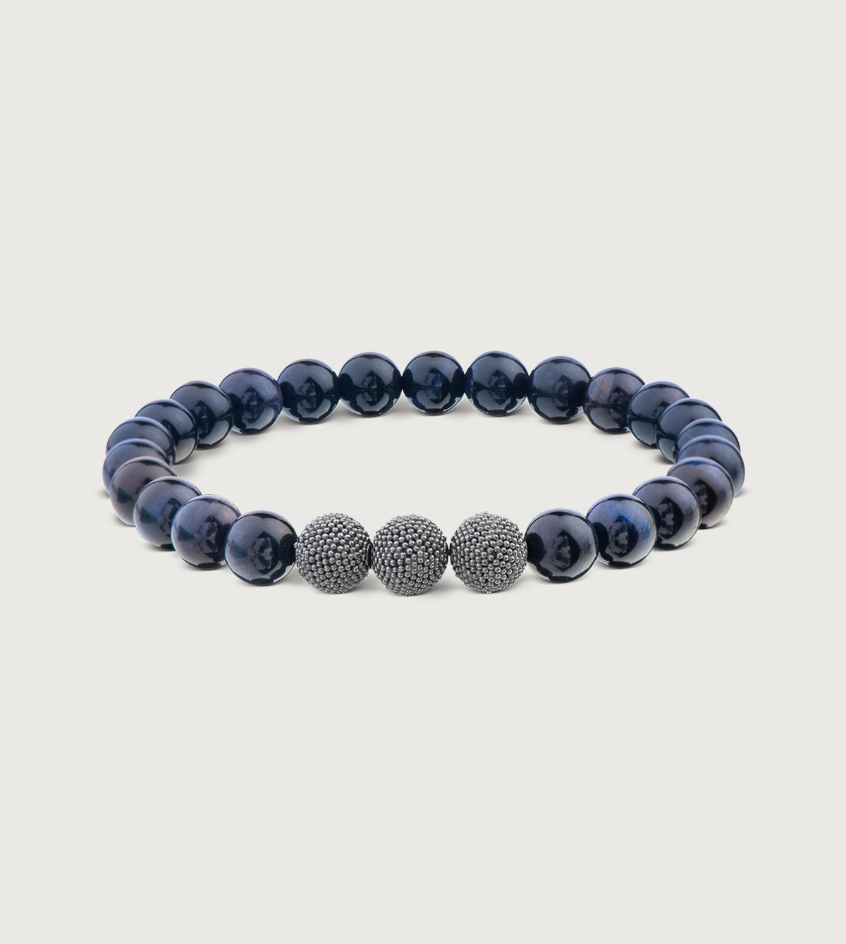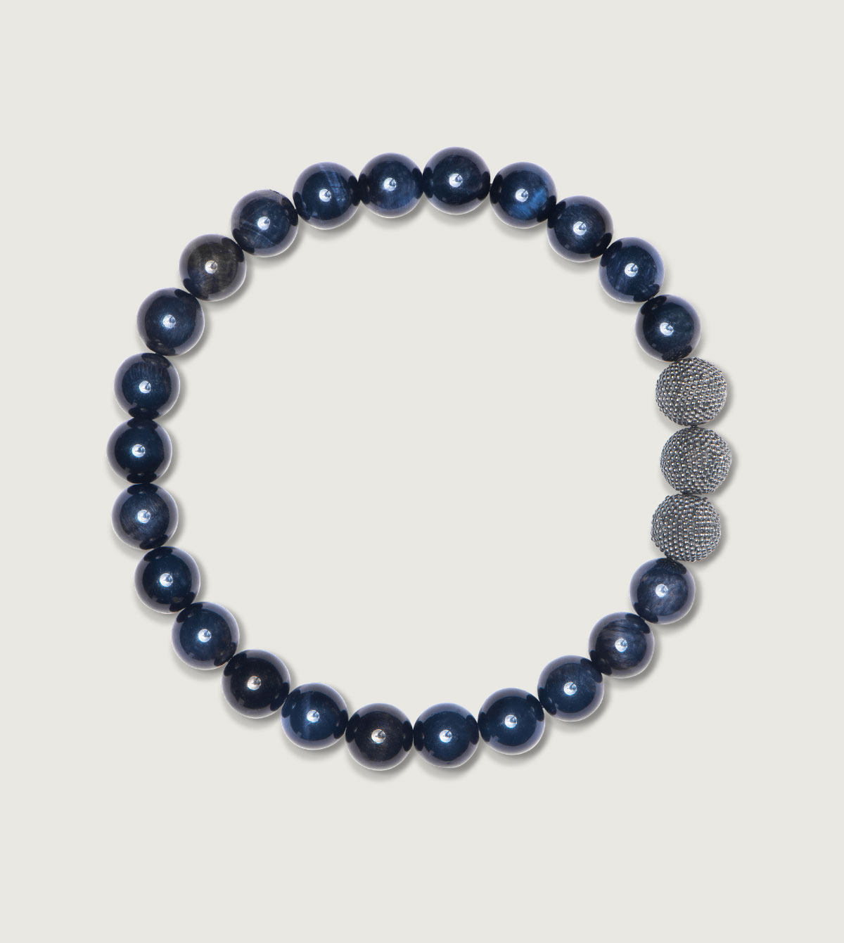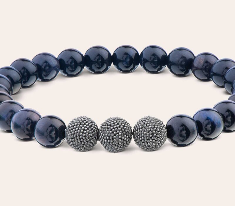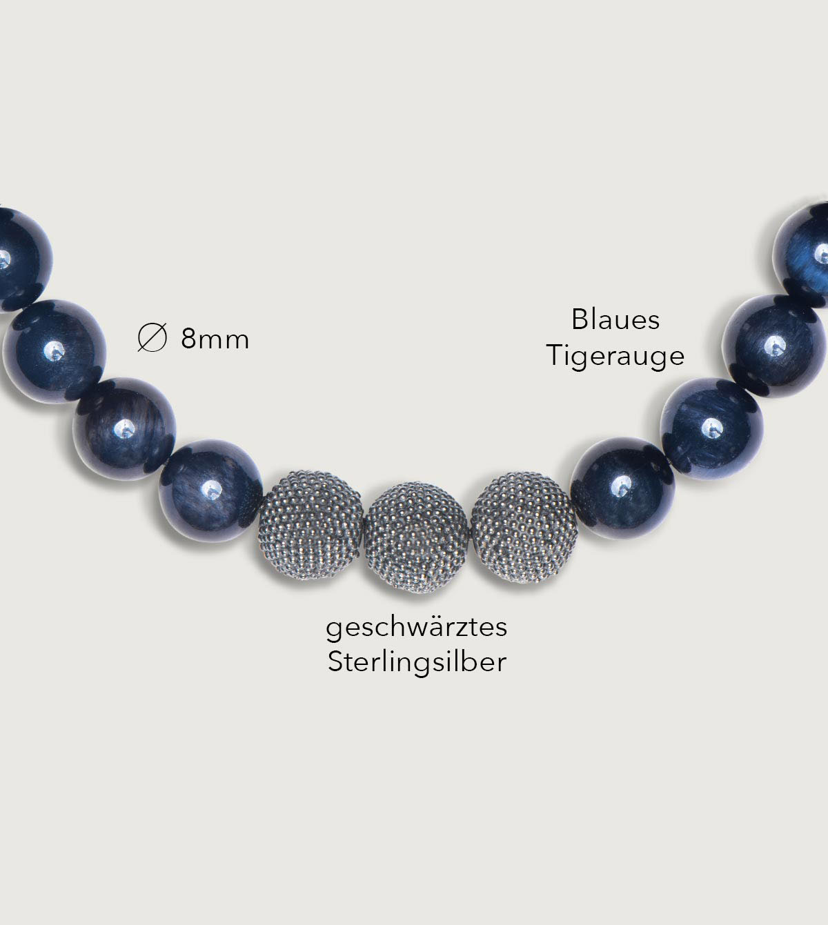 Unser elegantes Herrenarmband aus nachtblauem Tigerauge (8 mm) besticht durch die ruhige Harmonie im Zusammenspiel mit den geschwärzten Silberperlen – Dein dezenter Eyecatcher für den stilvollen Alltag.