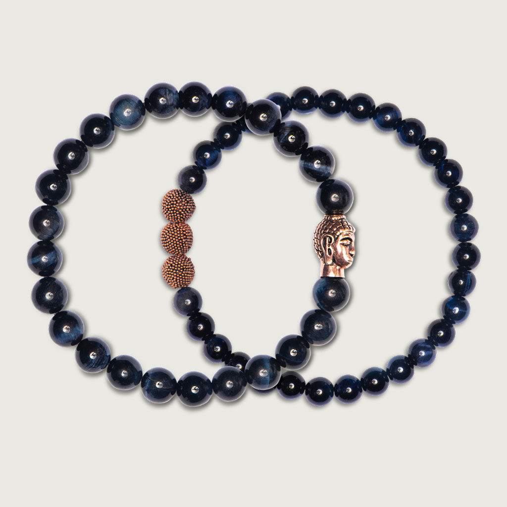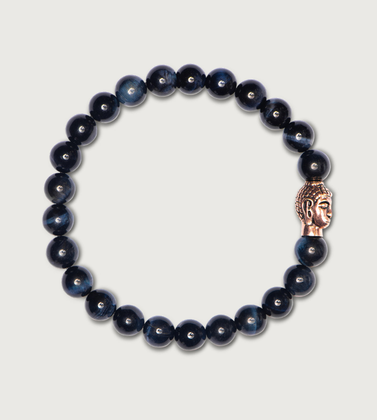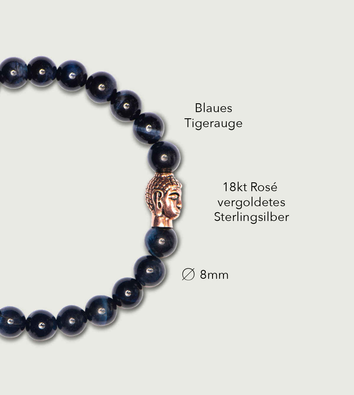 Das Ruhe ausstrahlende blaue Tigerauge in 8 mm besticht an diesem Herrenarmband durch die stilvolle Symbiose mit edlem Roségold des vergoldeten Buddha für einen eleganten Akzent an Deinem Handgelenk - einfach unkompliziert schön für ein elegantes Statement.
