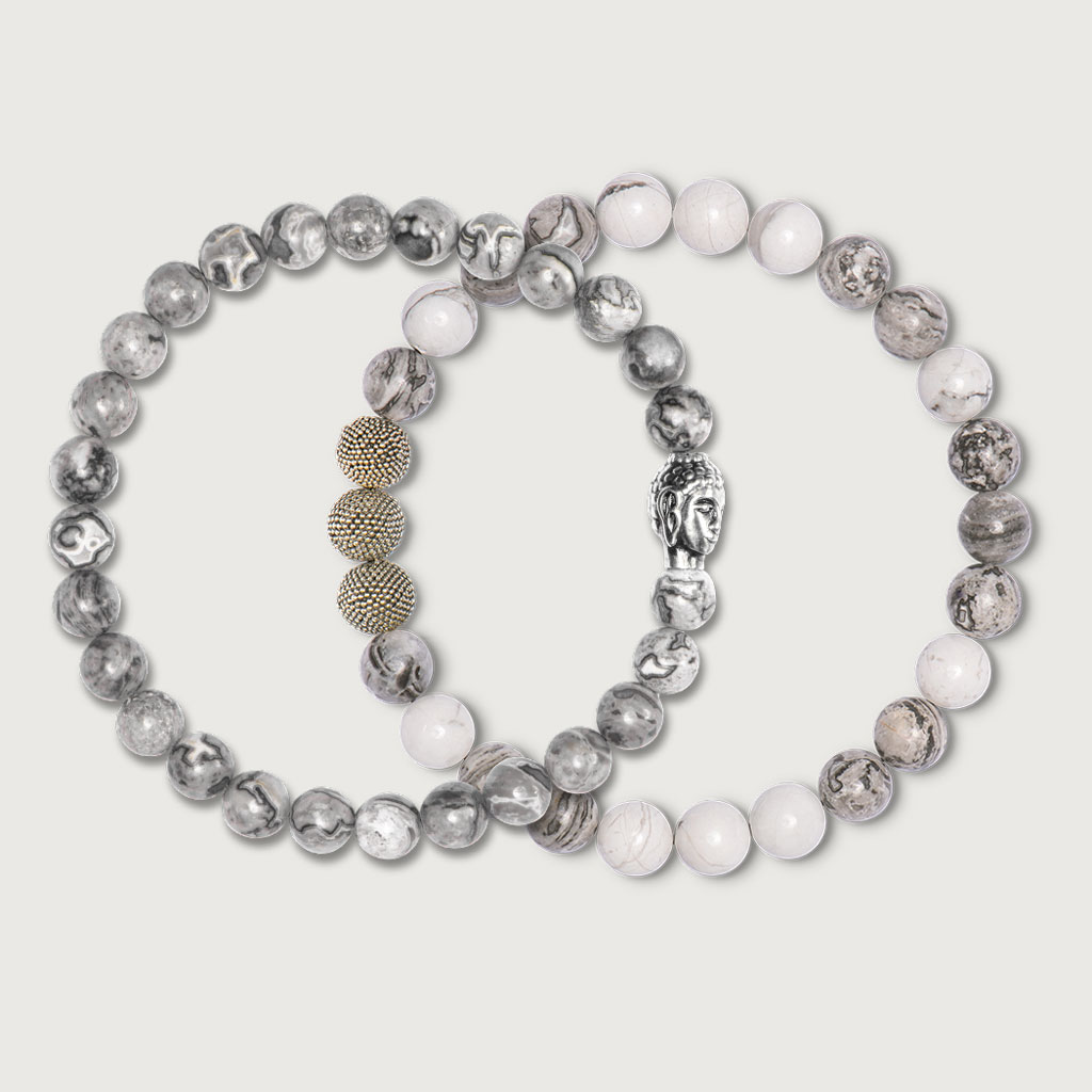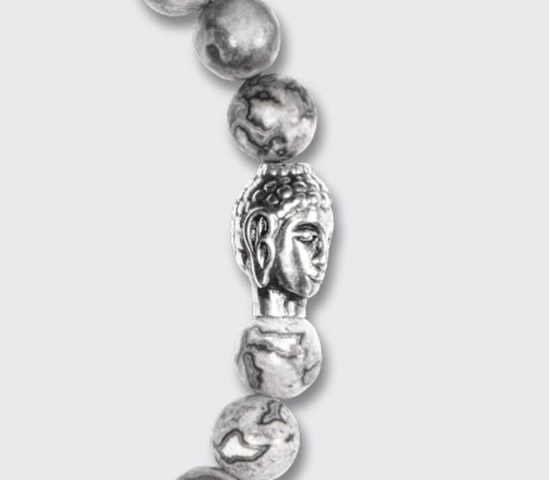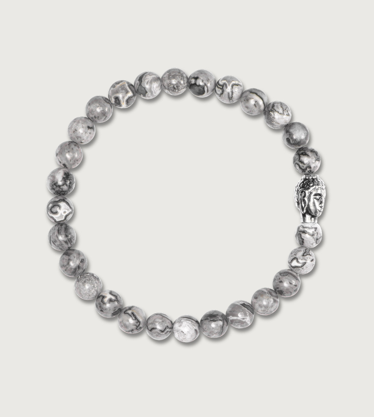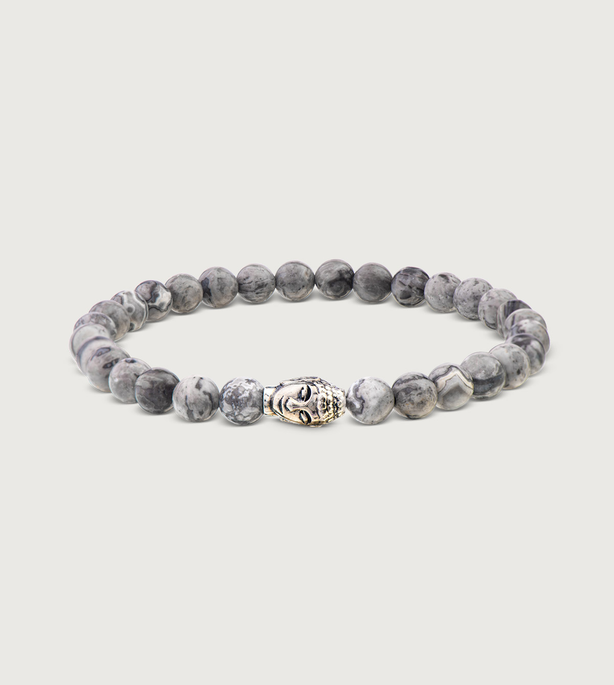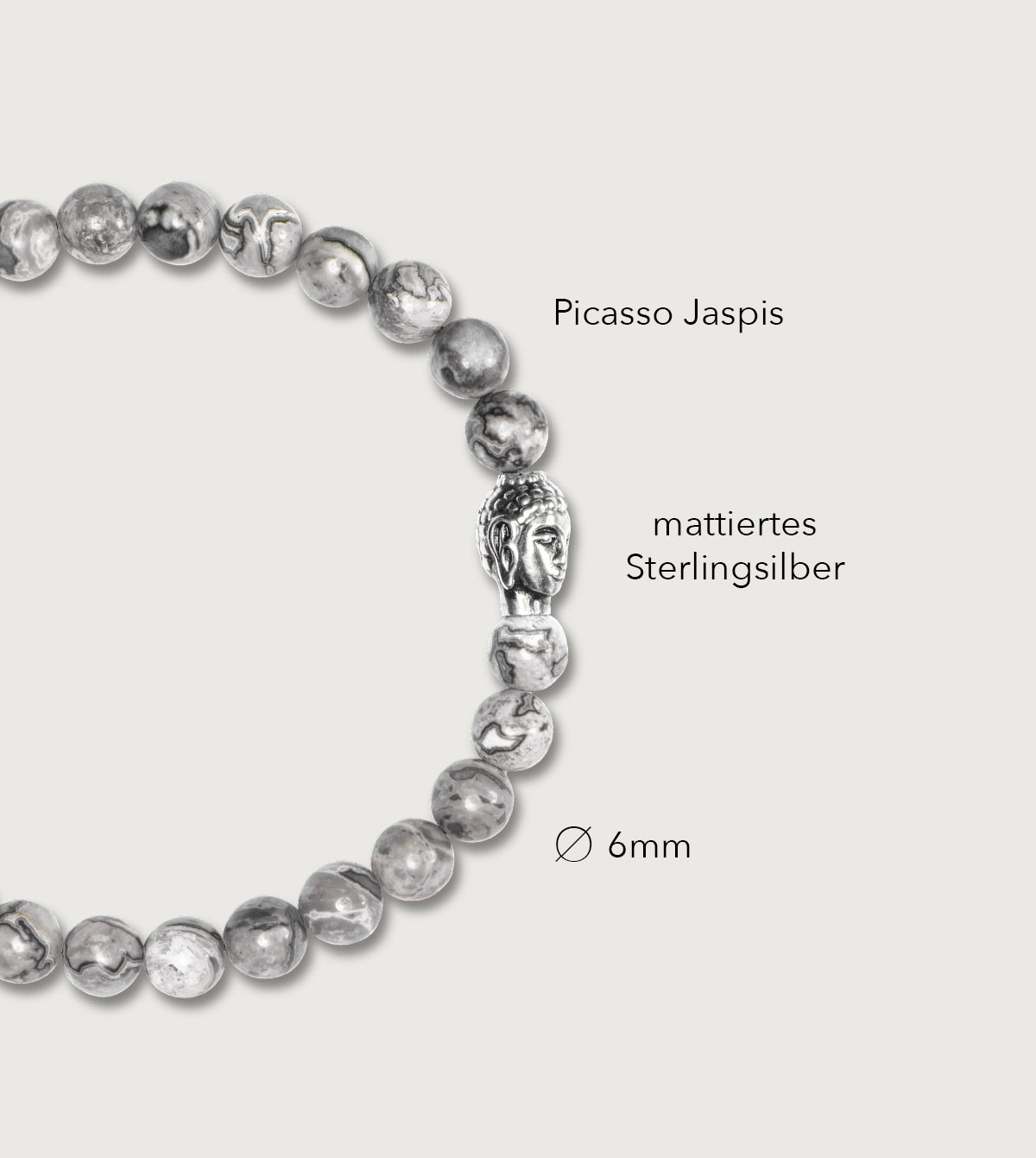 Buddha Armband im klassischen Mix aus Grau und Silber mit Picasso Jaspis in 6 mm. Der Buddha akzentuiert die puristische Farbgebung und verleiht Deinem Look einen legeren Touch für einen modebewussten Alltag.