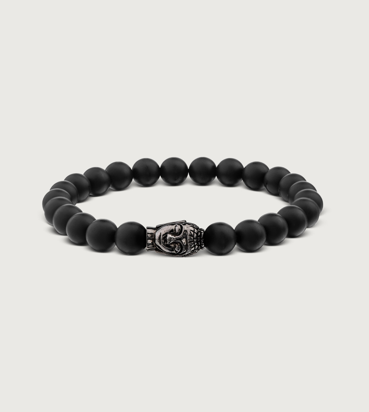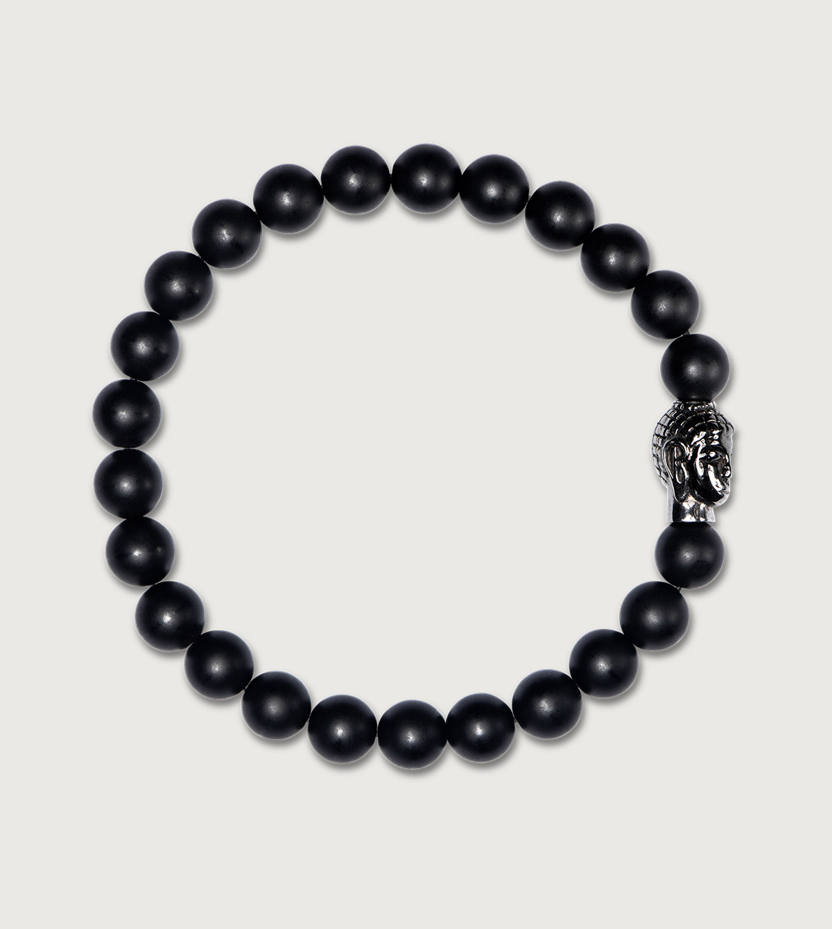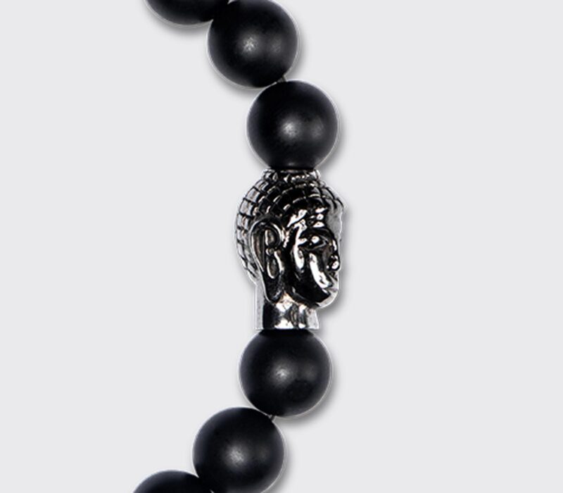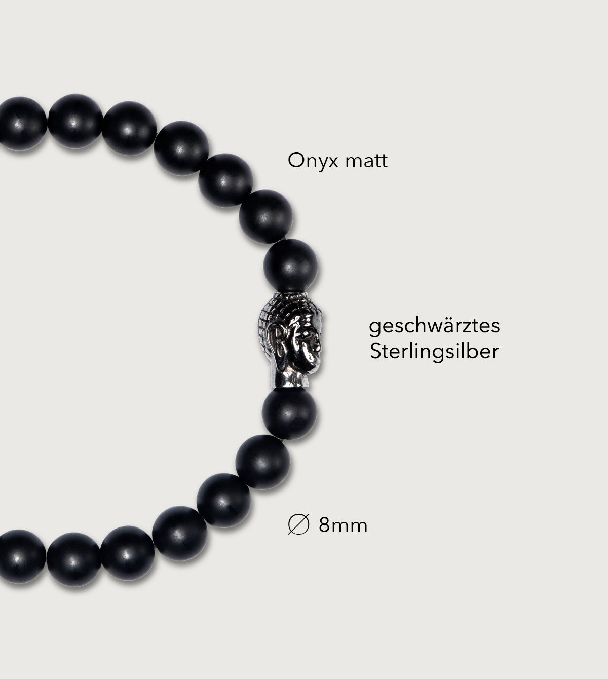 Minimalistisches Design prägt dieses Herrenarmband in Schwarz aus mattiertem Onyx in 8 mm mit geschwärztem Buddhakopf, der durch seinen tiefen Grauton zum edlen Eyecatcher an diesem Armband avanciert.