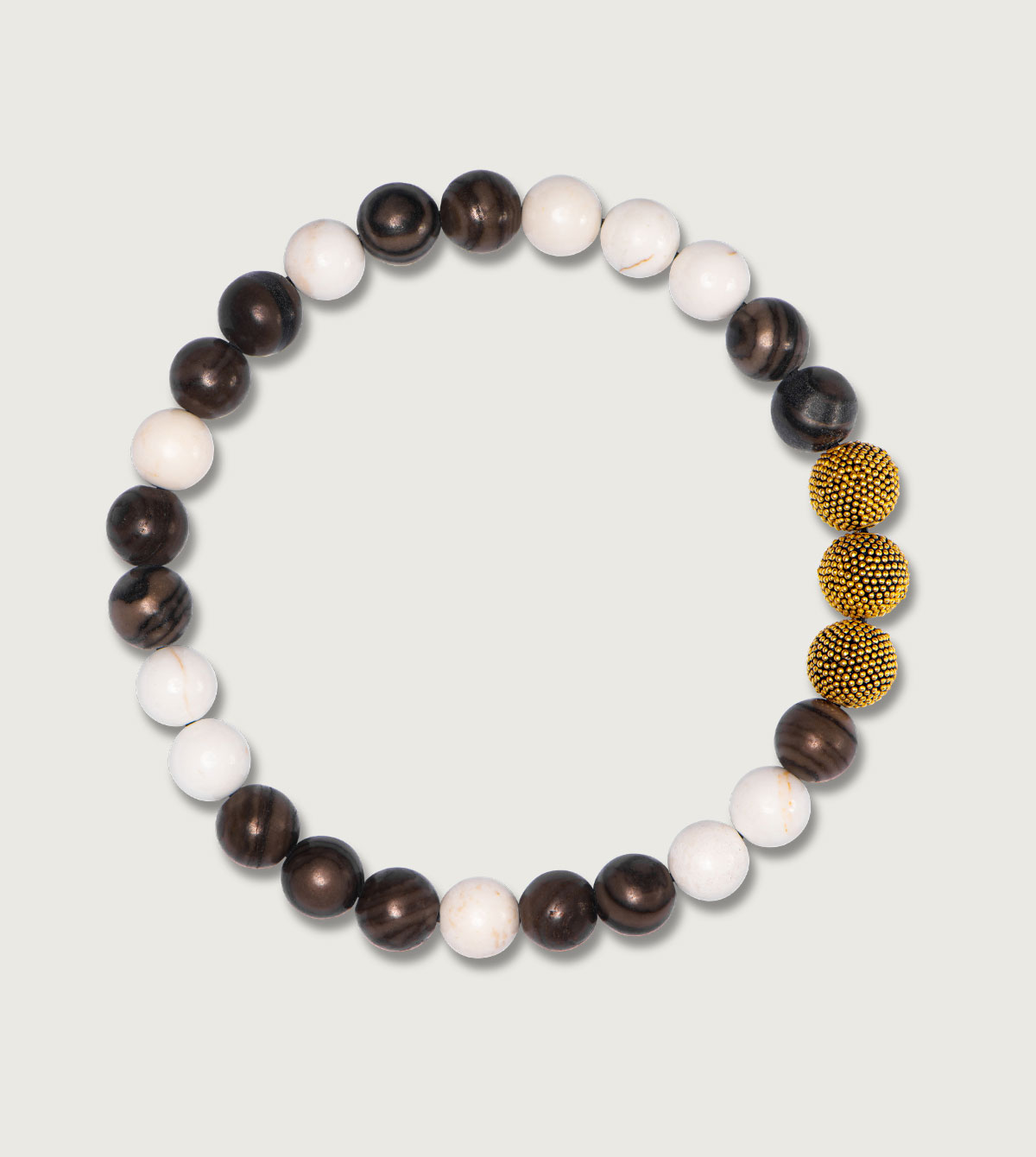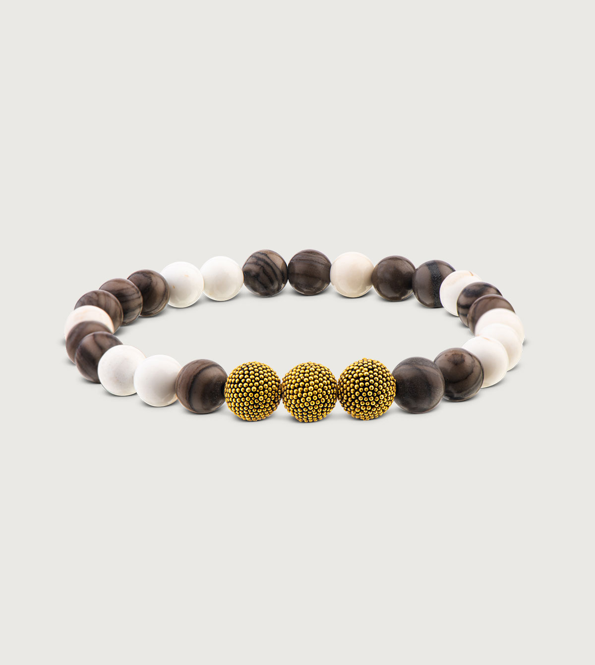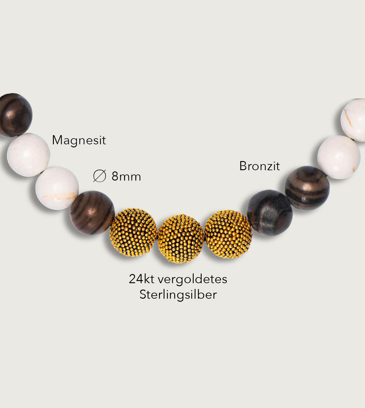 Verleihe Deinem Handgelenk das gewisse Etwas mit unserem sommerlichen Herrenarmband aus cremefarbenem Magnesit & schokobraunem Bronzit in 8 mm, kombiniert mit matt vergoldeten Silberperlen für Deinen legeren Look.