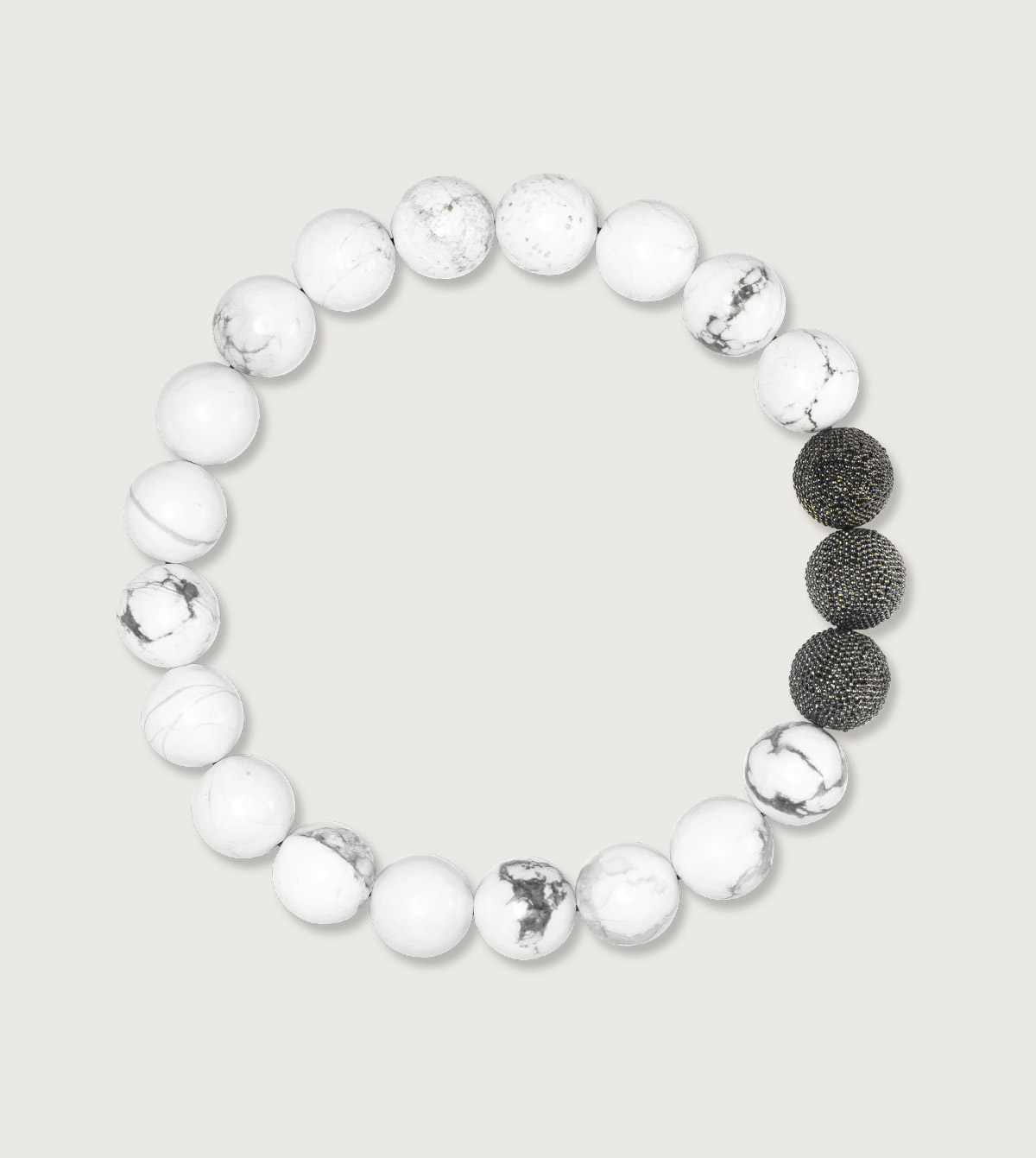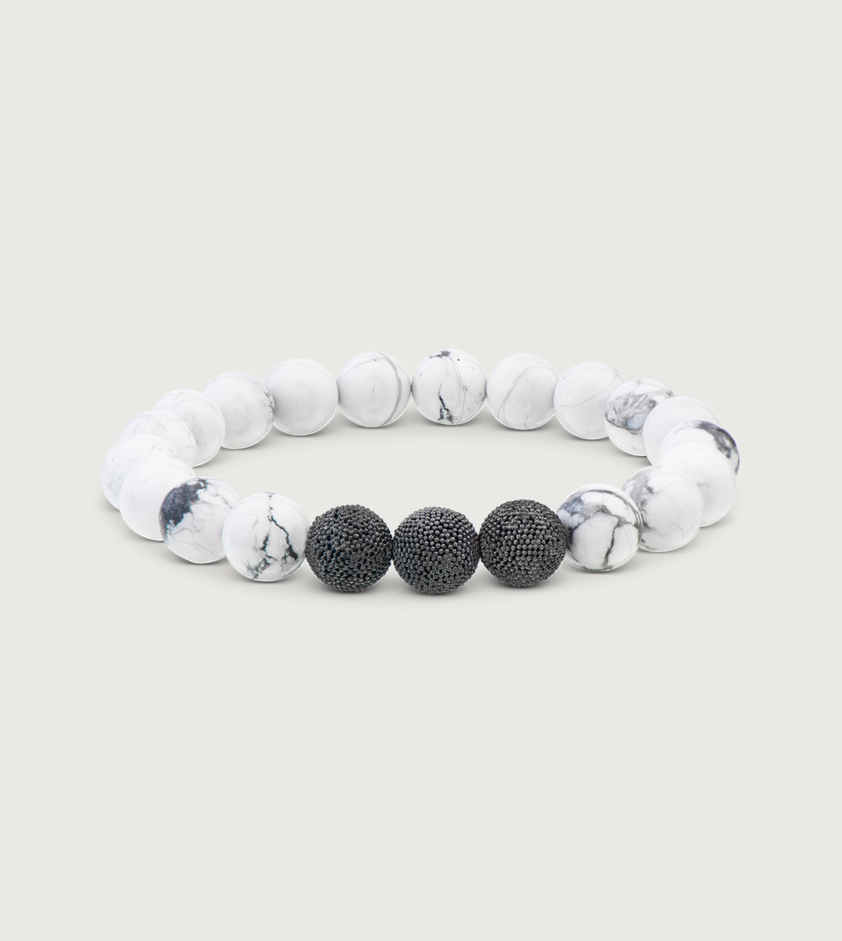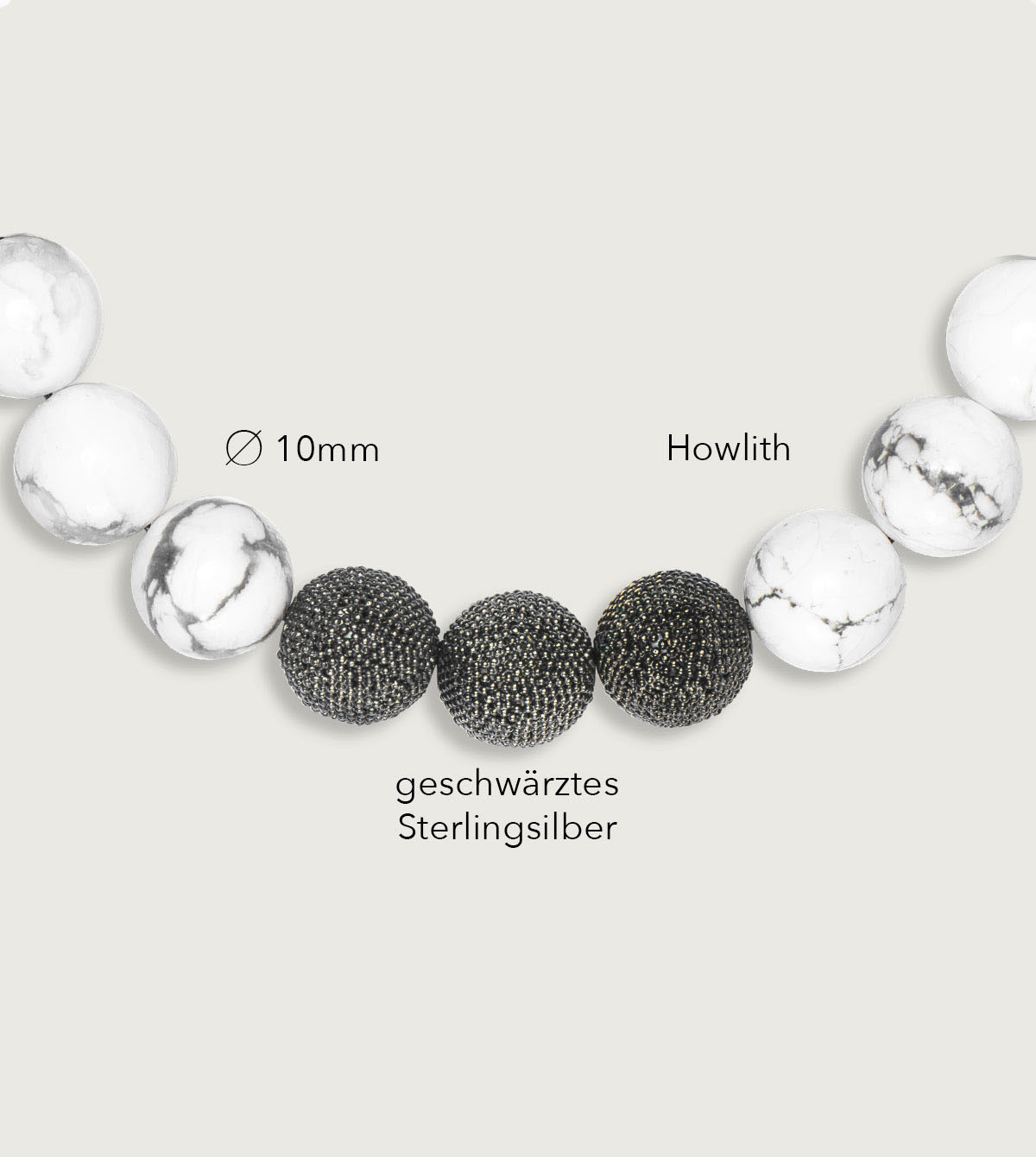 Schlichte Eleganz für stilvolles Understatement bietet dieses Herrenarmband mit kräftigen 10 mm Howlith Beads und den in exklusivem Black Rhodium veredelten Silberperlen - einfach & unkompliziert schön für Deinen stylischen Sommer-Look.