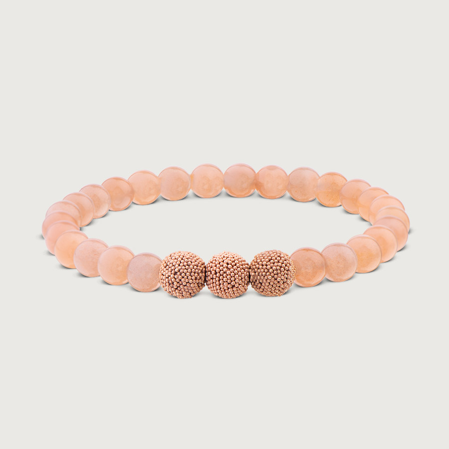 Rosa Mondstein hat durch seinen weichen, pfirsich-farbenen Schimmer eine grazile Ausstrahlung. Dabei ist sein Farbspiel leicht glasig, was dem Armband einen sanften Charakter verleiht. Im Hinduismus herrscht die Vorstellung, es handele sich beim Mondstein um verhärtete Strahlen des Mondes.