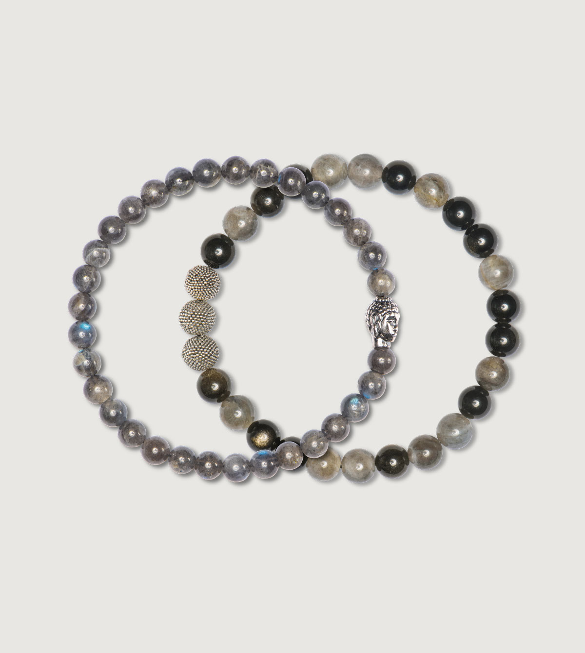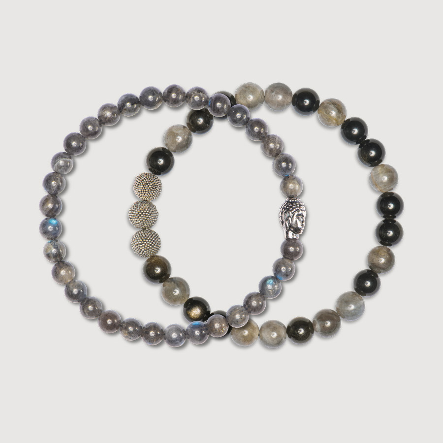 Dieses Armband Set vereint maskulinen Stil und edle Materialien, ideal für den Mann, der seine Stärke & Gelassenheit betonen möchte. Handgefertigt auf Bali aus natürlichem Labradorit & Goldobsidian, steht es für Schutz, Klarheit & Selbstbewusstsein. Der schimmernde Labradorit fördert Kreativität und inneres Wachstum, während Goldobsidian als Schutzstein vor negativen Einflüssen gilt.