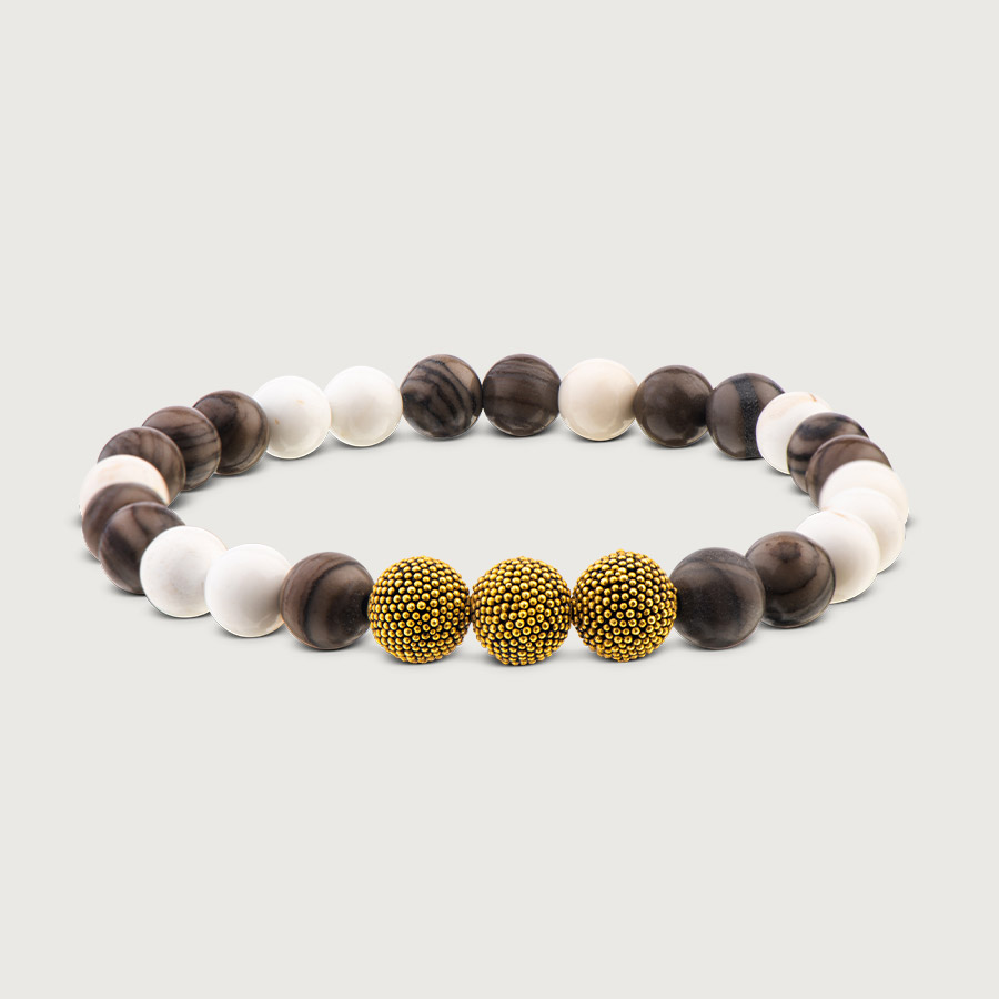 Verleihe Deinem Handgelenk das gewisse Etwas mit unserem sommerlichen Herrenarmband aus cremefarbenem Magnesit & schokobraunem Kaffee Jaspis in 8 mm, kombiniert mit matt vergoldeten Silberperlen für Deinen legeren Look.