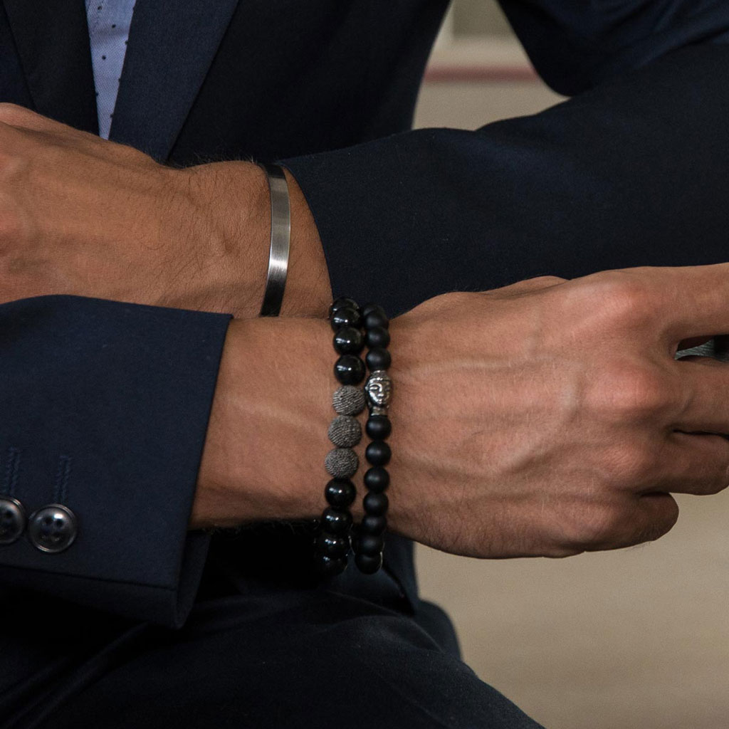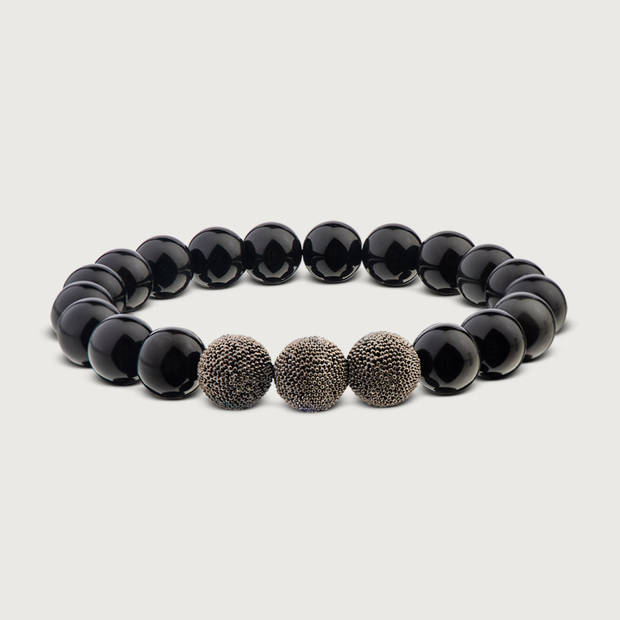 Dieses Herrenarmband zeigt, wie auch kräftige 10 mm Beads einen puristischen Stil erzeugen können. Der Obsidian harmoniert perfekt mit den in Black Rhodium veredelten Silberperlen und erzeugt so einen markanten Blickfang ohne aufdringlich zu wirken.