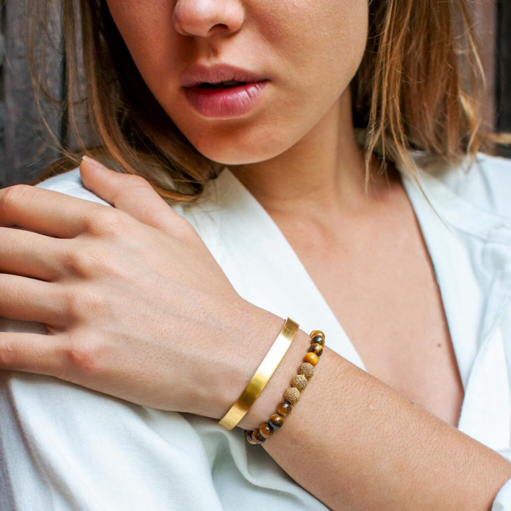 Minimalistisch im Design kannst Du den Armreif so gut wie zu all Deinen Outfits tragen. Ob edler Akzent zum Business Look oder elegant-lässig zu Casual Styles, ein goldener Armreif verleiht jedem Outfit einen Hauch von Glamour.