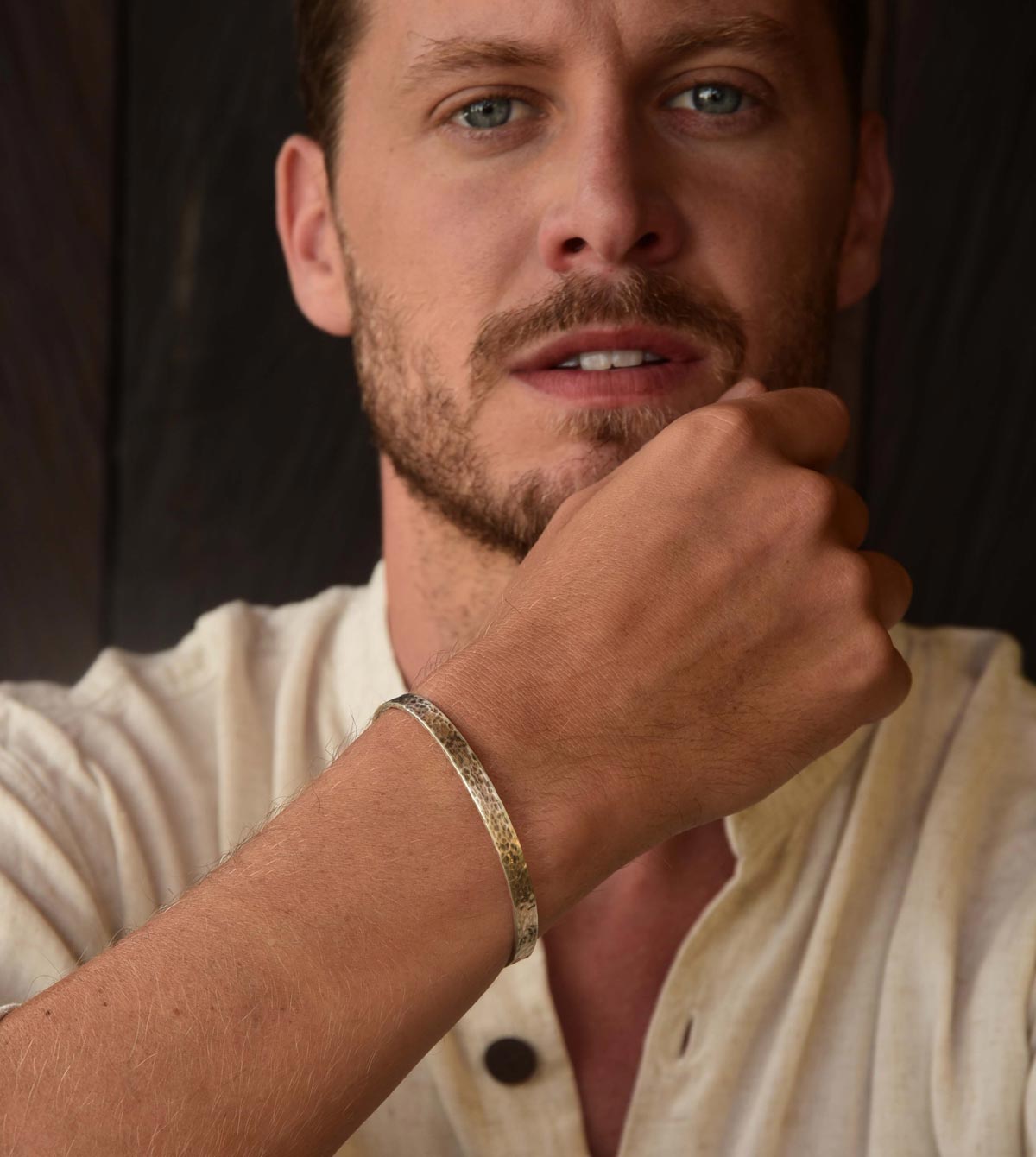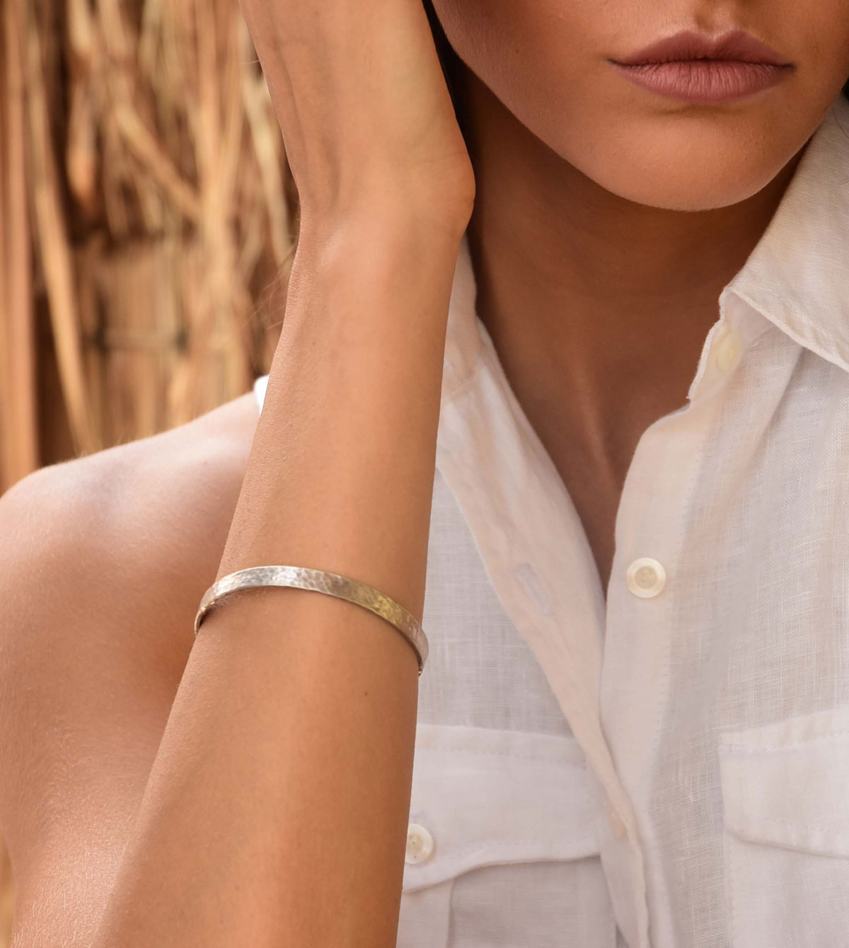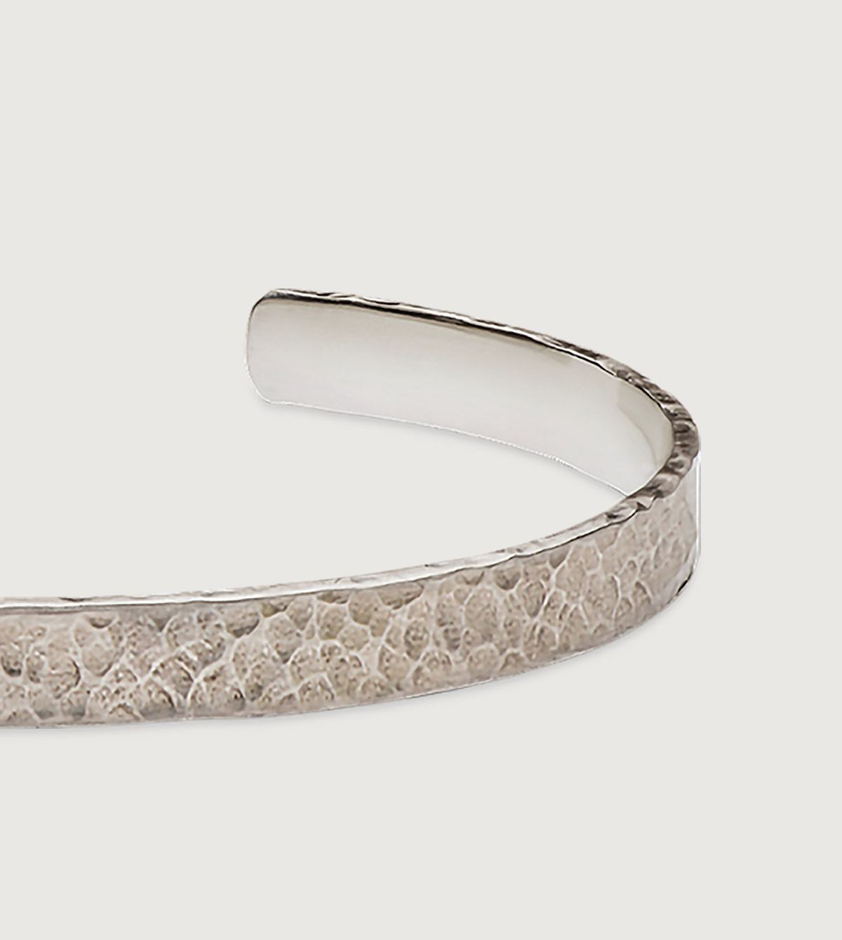 Die mattierte und gehämmert Oberfläche wurde nach traditioneller Technik von Hand beschlagen und gebürstet, was dem Armreif einen lebendigen Eindruck verleiht. Mit ca. 6,5 mm Breite kannst Du ihn gut einzeln oder als ideale Kombination zu anderen Armreifen & Armbändern tragen.