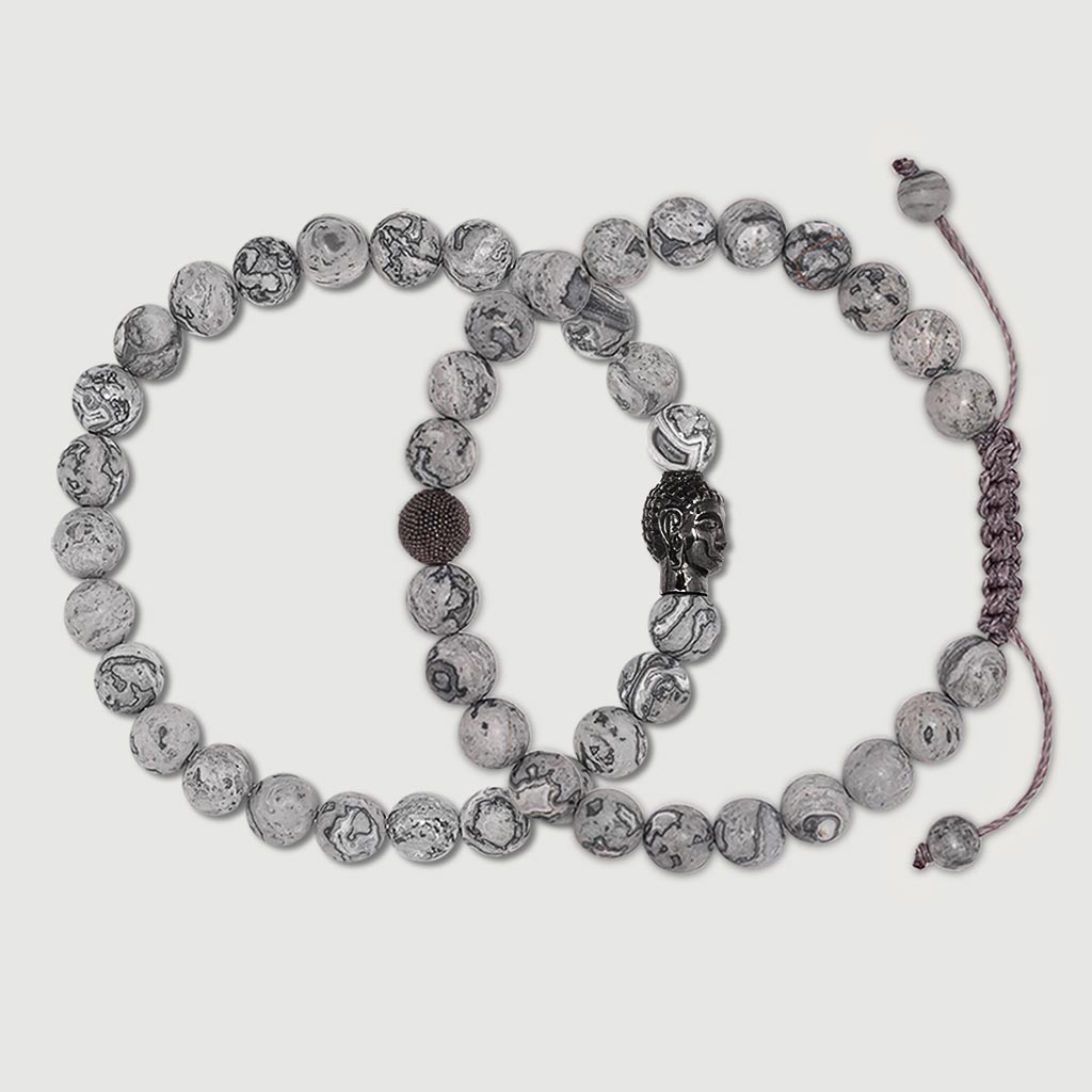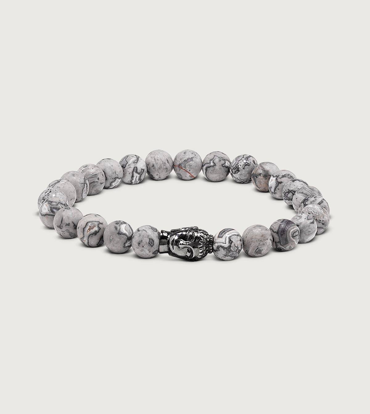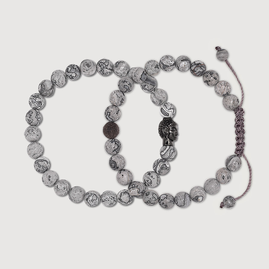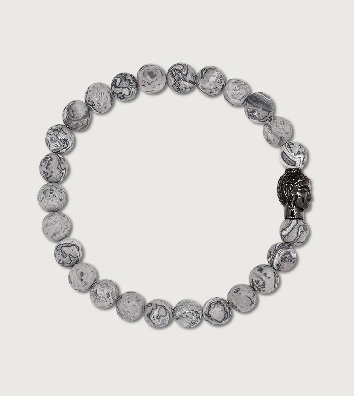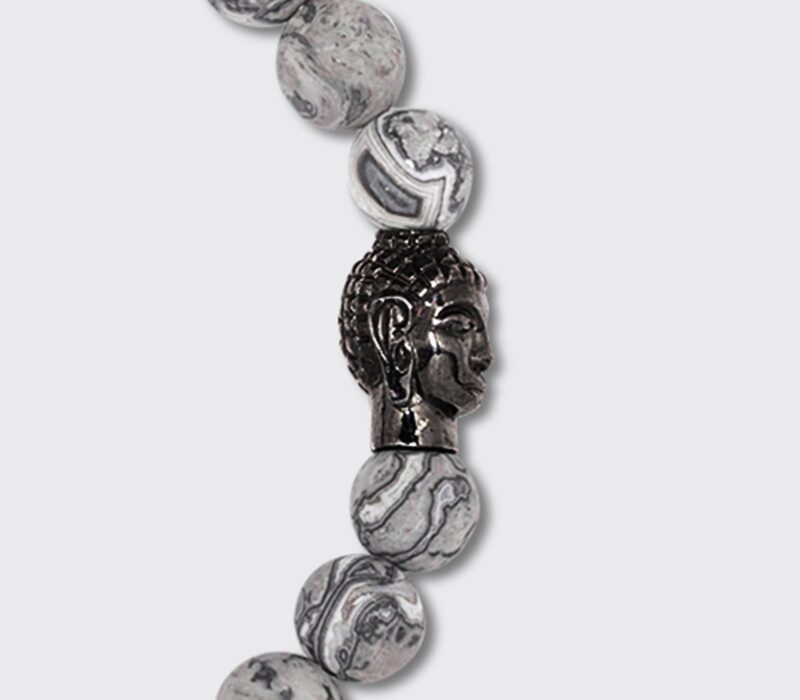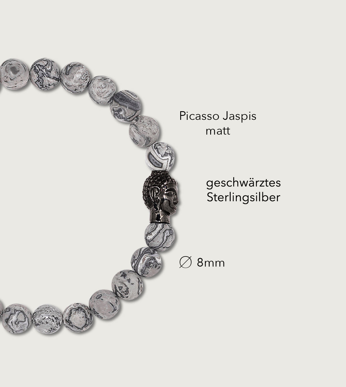 Beim Picasso Jaspis sieht keine Perle aus wie die andere, er wird von hell- bis dunkelgrauen, teils weißen Schlieren und Flecken durchzogen und es hat den Anschein, als blicke man auf den Globus einer fremden Welt. Picasso Jaspis wirkt stark erdend, unterstützt logisches Denken sowie konzentriertes Arbeiten und unterstützt Dich bei der Meditation. Die Symbiose aus matten 8 mm Perlen mit dem geschwärzten Buddha bildet ein zeitlos schönes Armband, das zu jedem Deiner Outfits ein stilvolles Highlight am Handgelenk schafft.