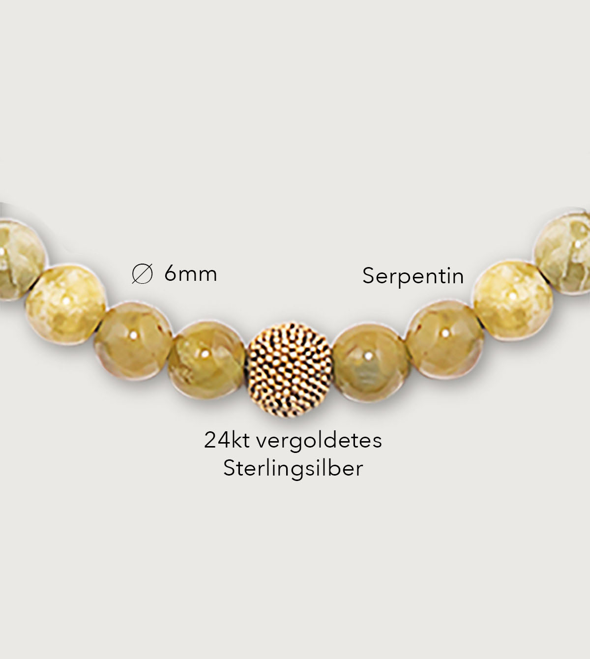 Die Kombination von grün-rotem Serpentin & vergoldeter Silberperle in 6mm verleiht diesem Armband einen elegant-filigranen Charakter und betont Deine feminine Ausstrahlung. Er gilt zudem als wahrer Stressdämpfer, gleicht Stimmungsschwankungen aus und hilft dabei öfter die Seele baumeln zu lassen. Die Perlen werden sorgfältig ausgewählt, um die einzigartige Maserung und Farbnuancen dieses begehrten Edelsteins zur Geltung zu bringen. Die matte Vergoldung der Silberperle in 24kt verleiht dabei dem Armband einen Hauch von Luxus, der Deinen Stil perfekt unterstreicht.