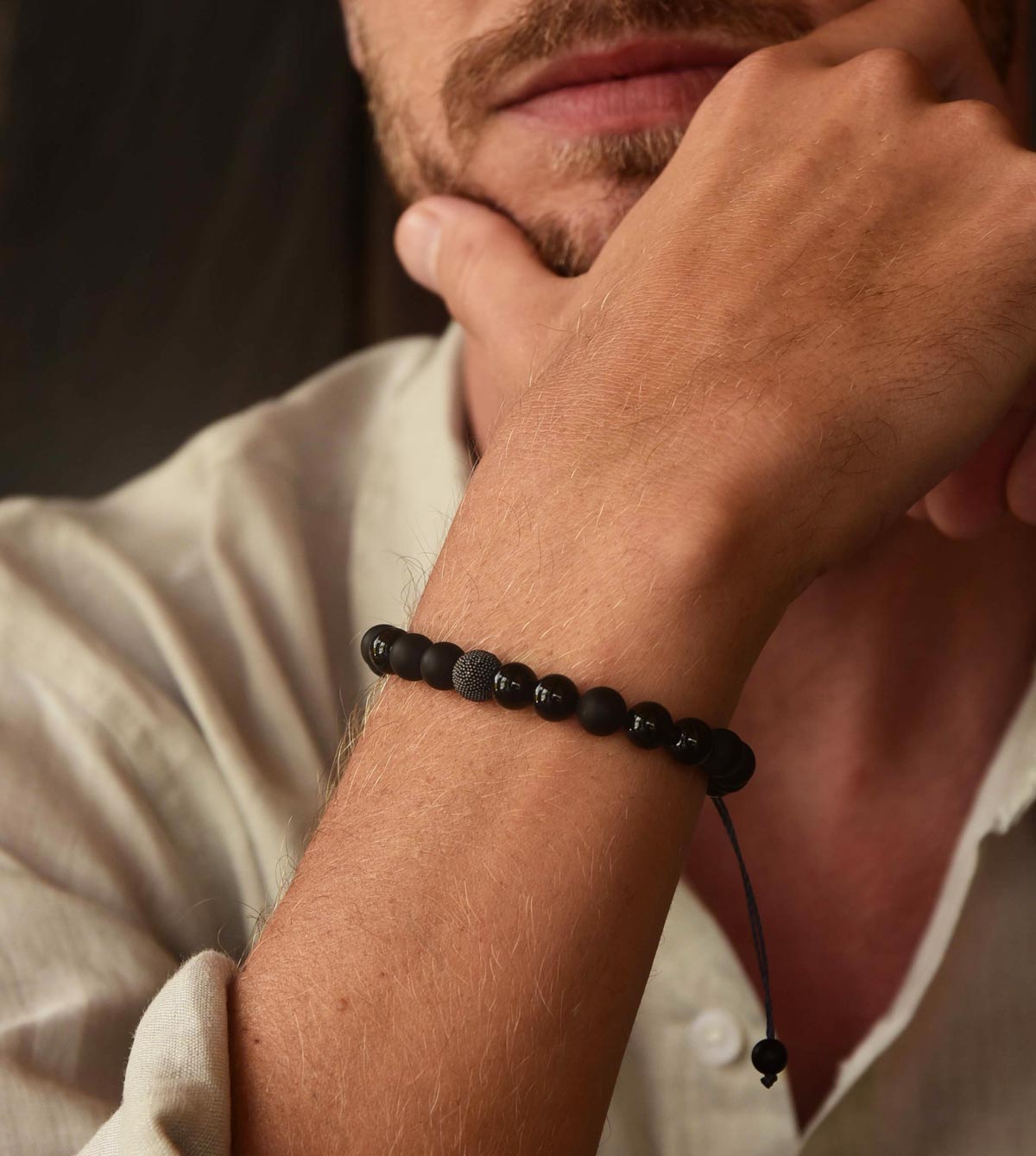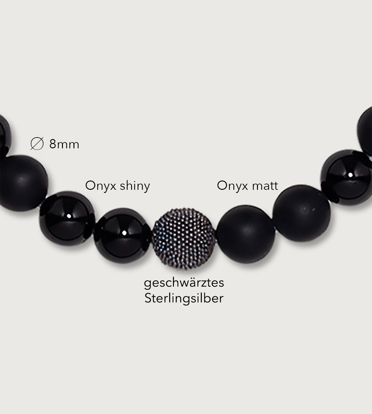 Entdecken die klassische Schönheit dieses Onyx Armbands in einer eleganten Kombination aus mattem & glänzendem Perlen, stilvoll betont durch eine geschwärzte Silberperle. Durch die Kombination von mattem und glänzendem Finish wird eine spannende Textur erzeugt, die das Licht einfängt und subtile Kontraste erzeugt. Onyx steht für Stärke und Standhaftigkeit und wird in vielen Kulturen als Schutzstein angesehen. Dieses edle Armband begeistert mit seiner zeitlosen Schönheit & schlichte Eleganz, die Du jeden Tag mit stilvoll mit Deinen Outfits kombinieren kannst.