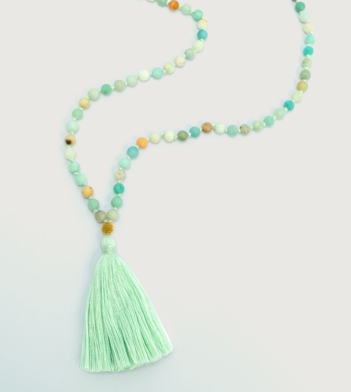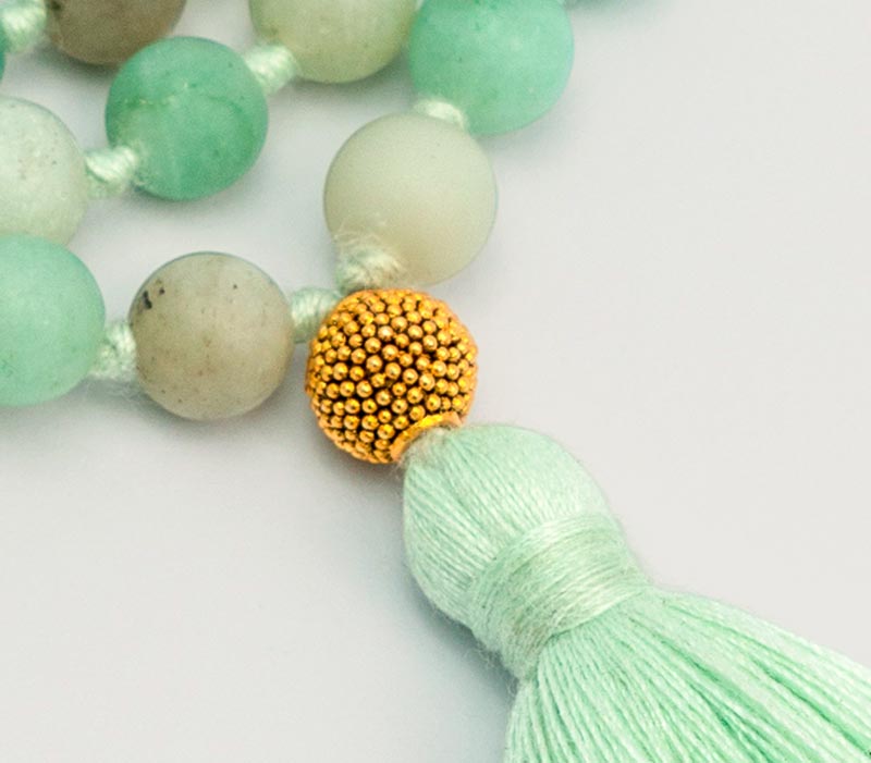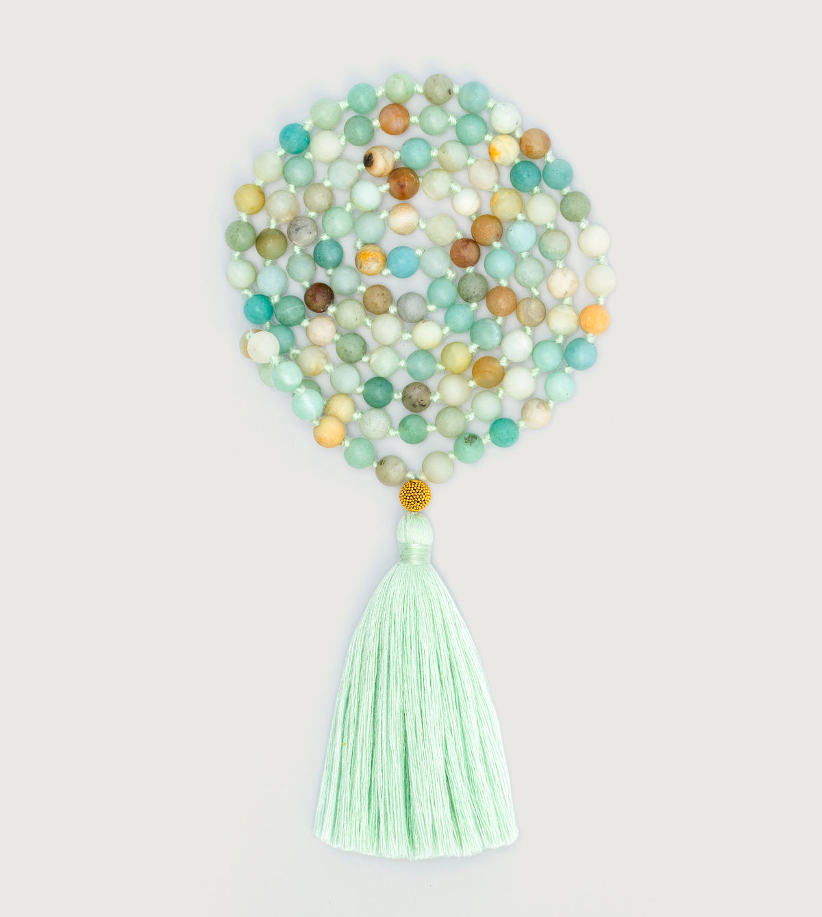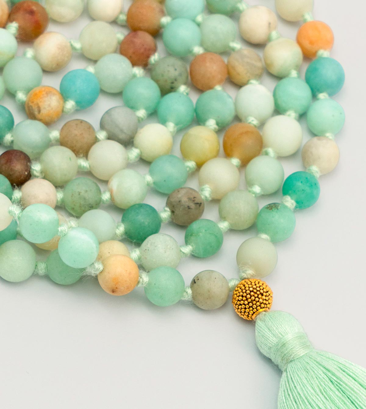 Diese Mala mit mattem, natürlichem Amazonit vereint Klarheit, Leichtigkeit und Ausdruckskraft. Der türkisgrüne Edelstein unterstützt Dich dabei, Deine innere Wahrheit zu leben und fördert emotionale Balance. Amazonit steht für Selbstbestimmung, Gelassenheit und liebevolle Kommunikation – ideal für achtsame Ausrichtung im Alltag. Die Perlen sind von Hand geknüpft und werden ergänzt durch eine Guru-Perle aus 18k Gold Vermeil. Diese Mala begleitet Dich durch herausfordernde Situationen, schenkt Dir Klarheit im Herzen und Ausdruckskraft in Deinen Worten – ein stilvoller Anker in Deinem spirituellen Alltag.