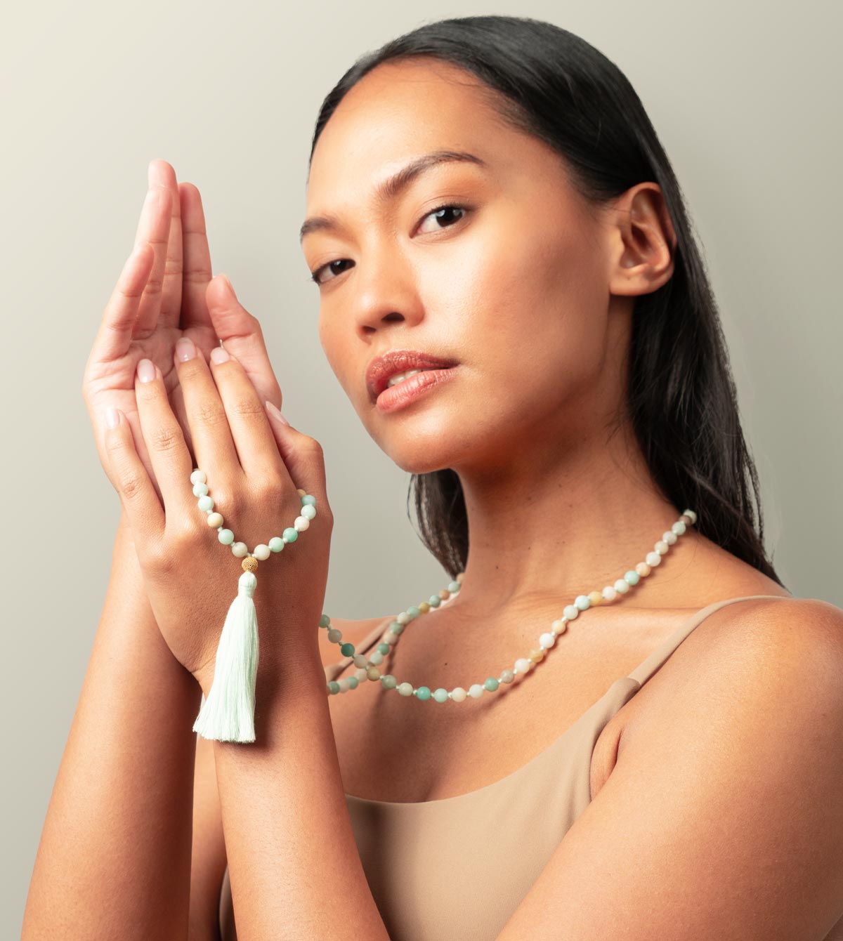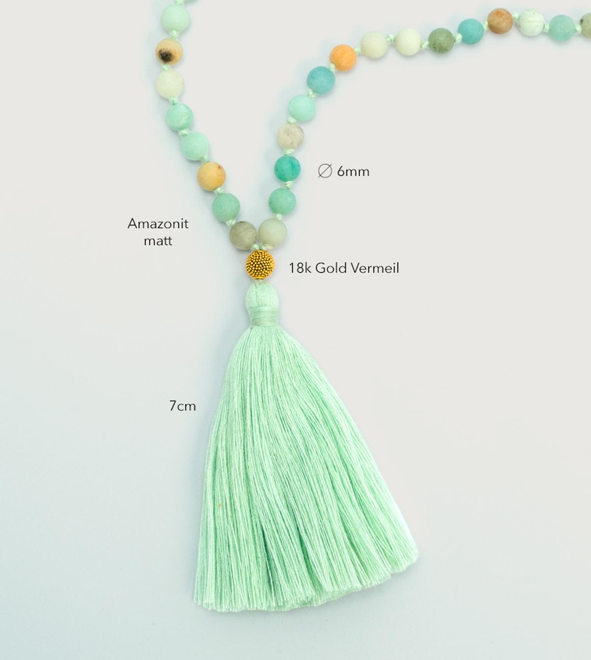 Wenn Dir das Außen zu laut wird, erinnert Dich dieses Mala mit mattem Amazonit an Deine innere Weite. Grün-blaue Töne stehen für Wasser, Klarheit und Loslassen. 108 handgeknüpfte Perlen, eine handgefertigte Guru-Perle aus 18k Gold Vermeil – für Frauen, die mit Ruhe, Stil und Achtsamkeit durch den Alltag gehen.